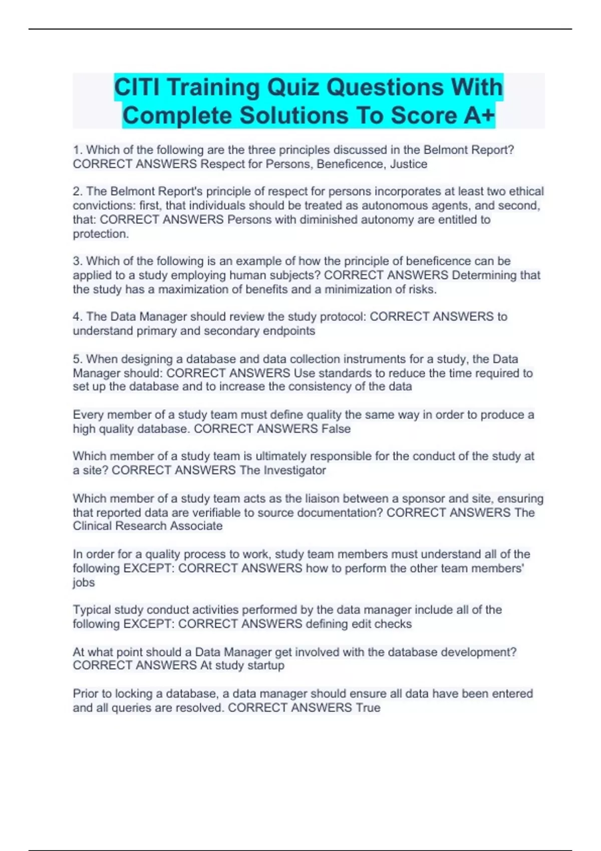 CITI Training Quiz Questions With Complete Solutions To Score A
