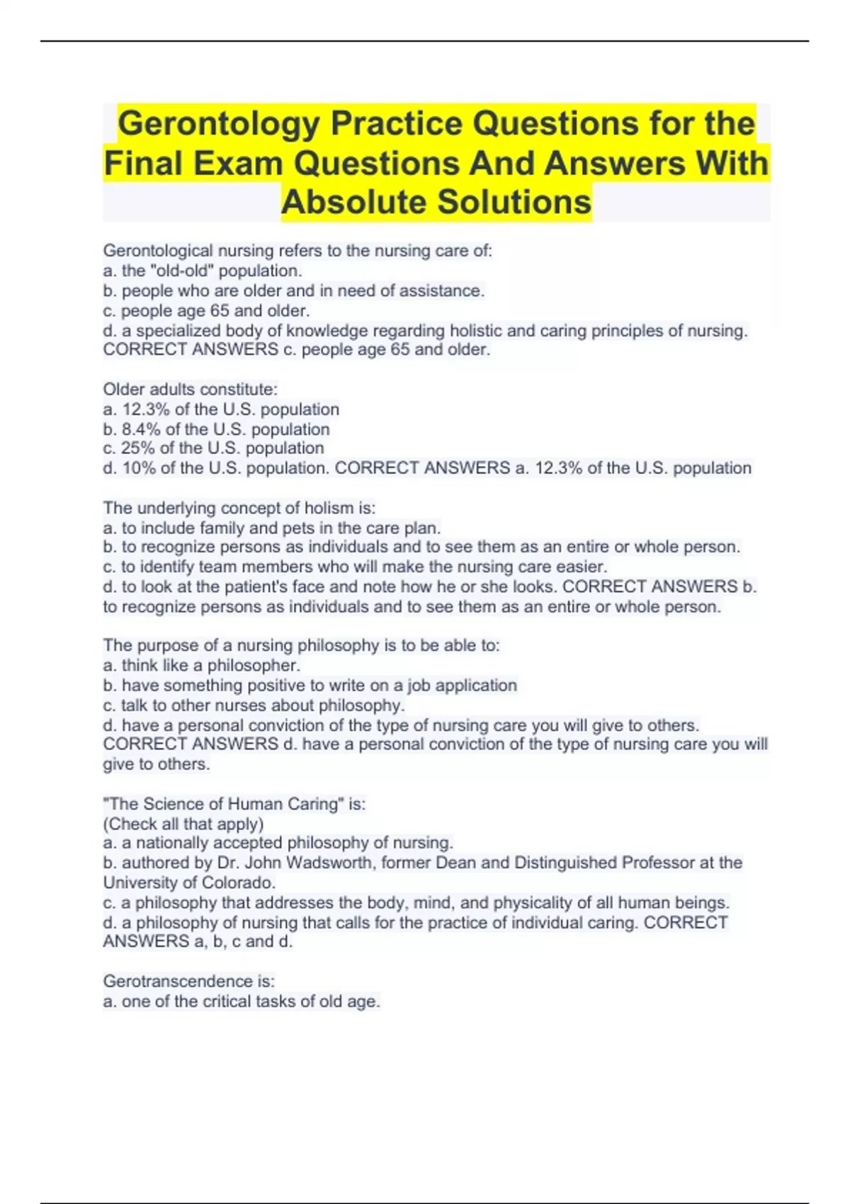 Gerontology Practice Questions for the Final Exam Questions And Answers With Absolute Solutions