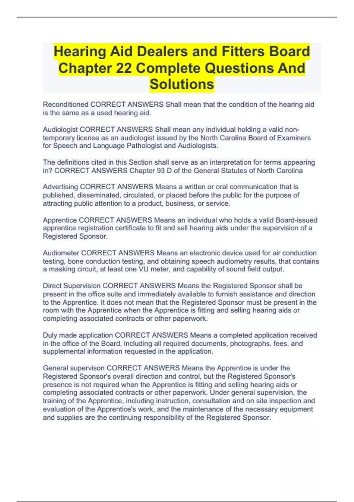 Hearing Aid Dealers and Fitters Board Chapter 22 Complete Questions And Solutions