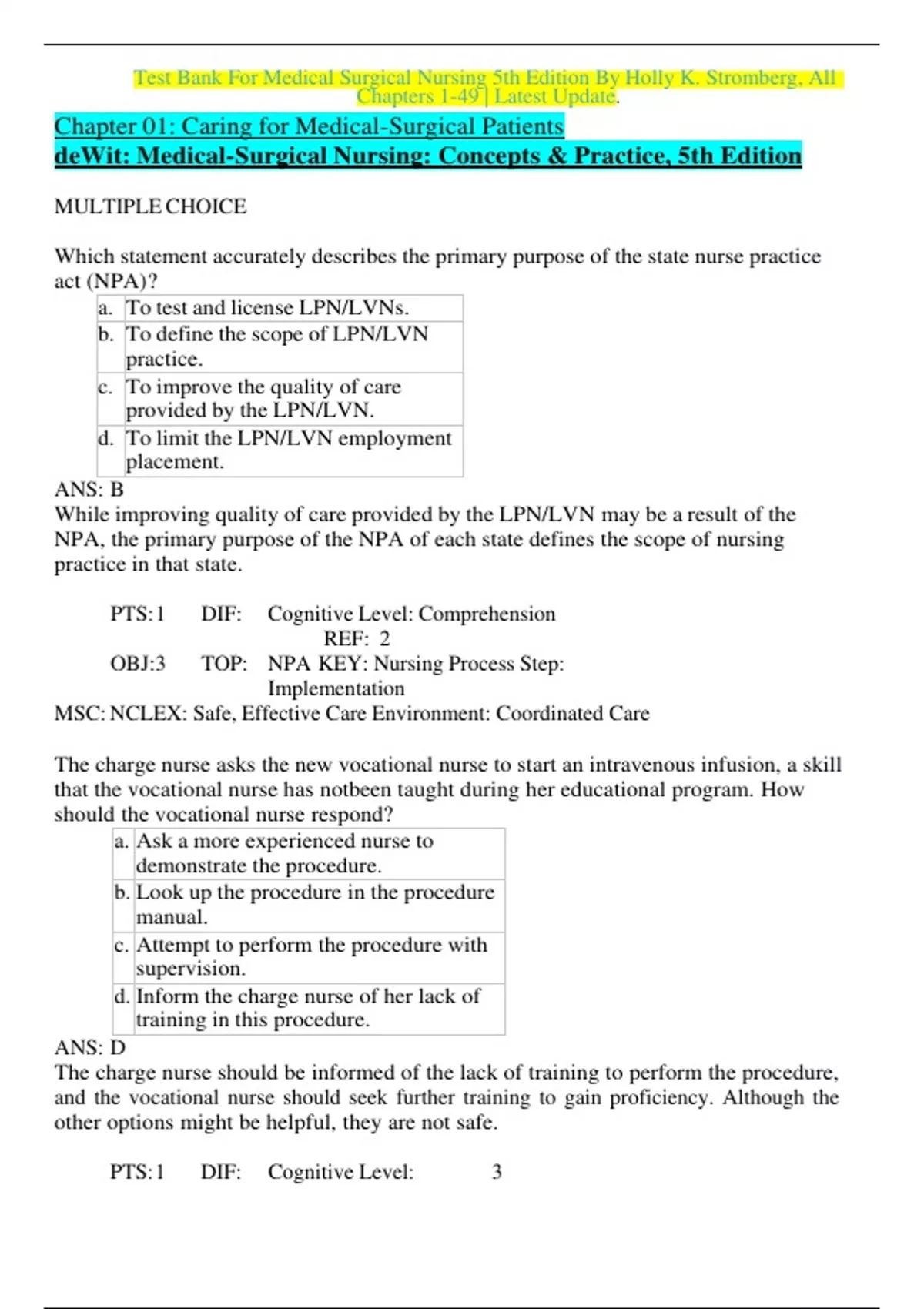 Test Bank for Medical-Surgical Nursing 5e 5th Edition by Holly K. Stromberg. ISBN-13: 0210 Unit I. Medical-Surgical Nursing Settings 1. Caring for Medical-Surgical Patients Caring for Medical-Surgical Patients Roles of the LPN/LVN Employment Opportunities Ethical and Legal Practice Quality and Safe...