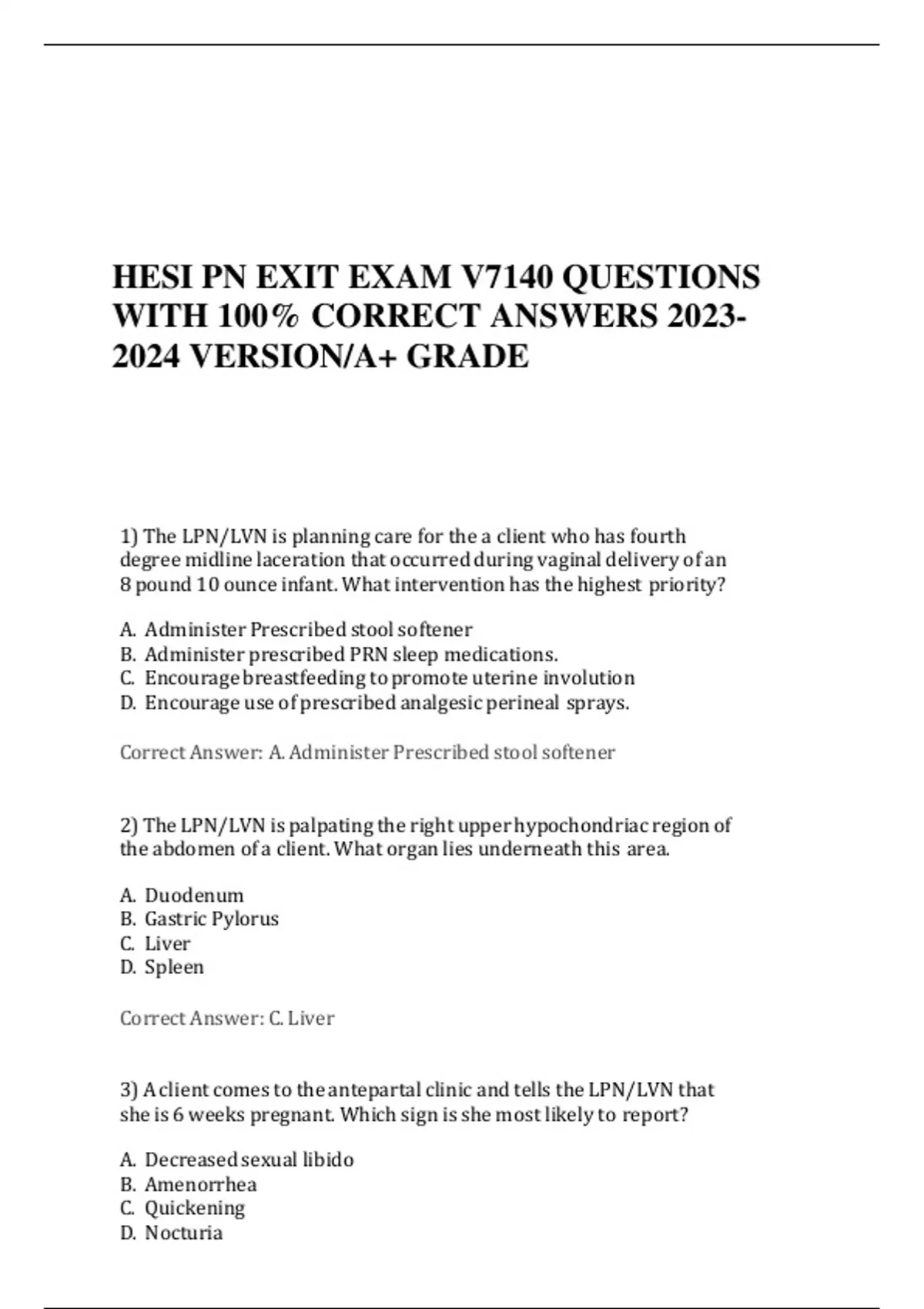HESI PN EXIT EXAM V7140 QUESTIONS WITH CORRECT ANSWERS 2024 VERSION/A+ pass