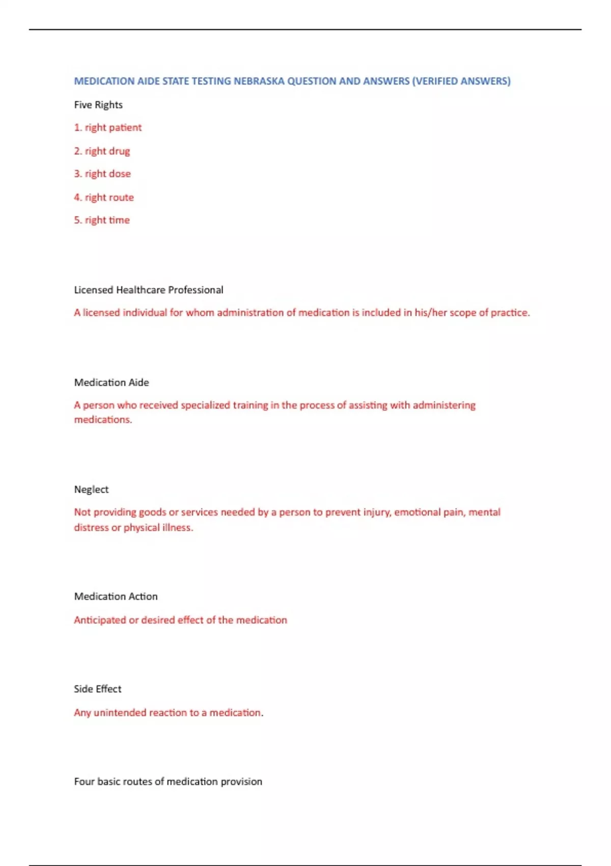 MEDICATION AIDE STATE TESTING NEBRASKA QUESTION AND ANSWERS (VERIFIED ANSWERS)