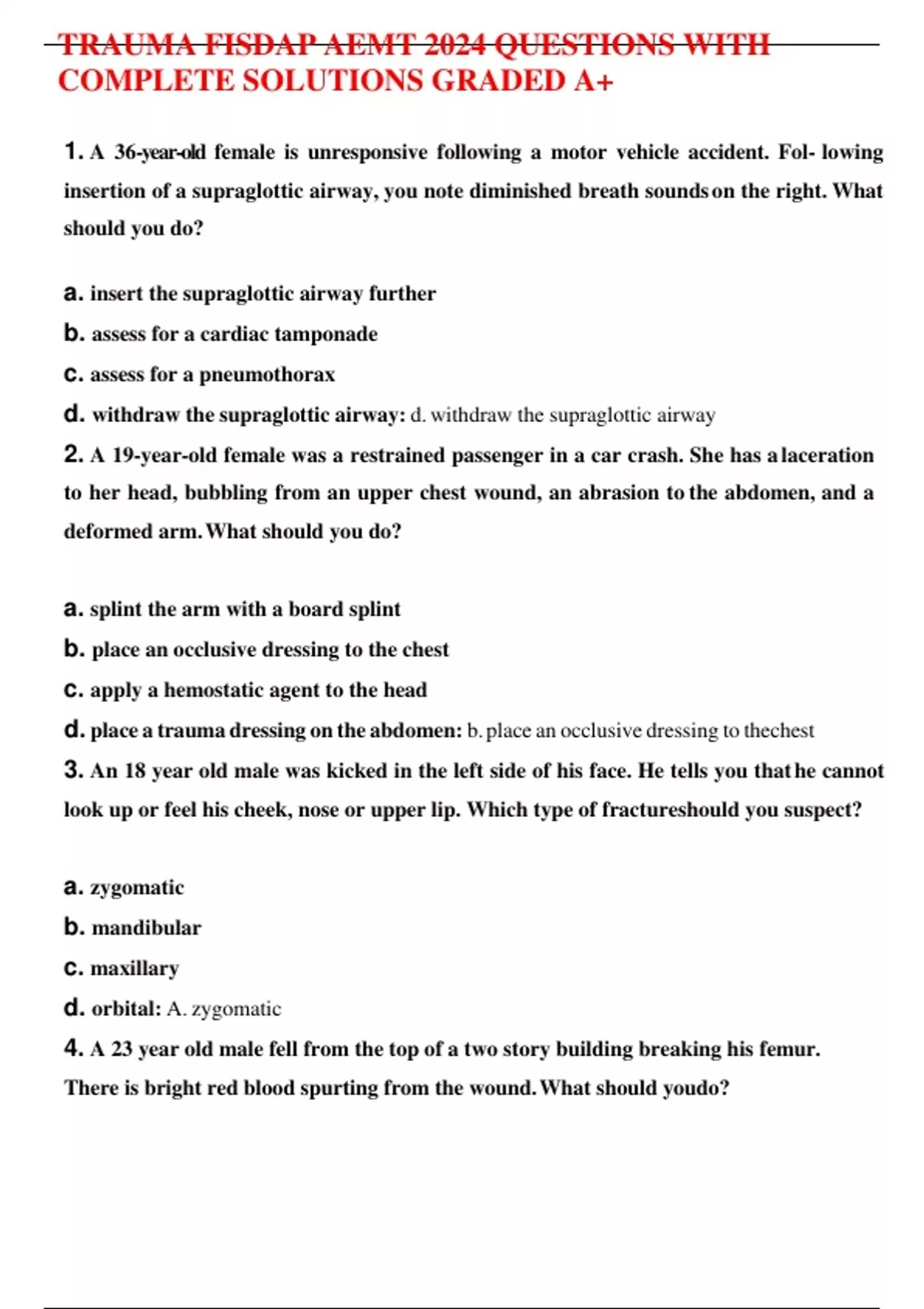 1. A 36-year-old female is unresponsive following a motor vehicle accident. Fol- lowing insertion of a supraglottic airway, you note diminished breath sounds on the right. What should you do? a. insert the supraglottic airway further b. assess for a cardiac tamponade c. assess for a pneumothorax d. withdraw the supraglottic airway: d. withdraw the supraglottic airway 2. A 19-year-old female was a restrained passenger in a car crash. She has a laceration to her head, bubbling from an upper chest wound, an abrasion to the abdomen, and a deformed arm. What should you do? a. splint the arm with a board splint b. place an occlusive dressing to the chest c. apply a hemostatic agent to the head d. place a trauma dressing on the abdomen: b. place an occlusive dressing to the chest 3. An 18 year old male was kicked in the left side of his face. He tells you that he cannot look up or feel his cheek, nose or upper lip. Which type of fracture should you suspect? a. zygomatic b. mandibular c. maxillary d. orbital: A. zygomatic 4. A 23 year old male fell from the top of a two story building breaking his femur. There is bright red blood spurting from the wound. What should you do? a. establish intravascular access b. apply a tourniquet above the wound c. splint his left with a traction splint d. initiate immediate transport: b. apply a tourniquet above the wound 5. What sound would you expect to hear during chest percussion on a patient with a suspected pneumothorax? a. hyperresonance b. dull c. normal d. hyporesonance: A. hyperresonance 6. A 26 year old male has been stabbed in the left side of his chest. He presents with pale, cool skin and JVD. Vital signs are a BP 140/120, P 140, R 32 breath sounds equal bilateral. What should you suspect? a. hemopneumothorax b. cardiac contusion c. cardiac tamponade d. tension pneumothorax: C. cardiac tamponade 7. What is the most appropriate treatment for a sucking chest wound? a. apply an occlusive dressing b. assist ventilations with bag-valve mask c. tape a saline bag over the wound d. apply a bulky dressing to the wound: A. apply an occlusive dressing 8. A 50 year old male has a long piece of wood impaled in his left anterior chest and protrudes out his back. He is pale and diaphoretic with a weak radial pulse. What should you do? a. establish vascular access b. initiate rapid transport c. cut down the piece of wood d. provide high-flow oxygen: b. initiate rapid transport 9. A patient was attacked by a large animal. He is in severe respiratory distress. He has a large avulsion on his thigh and several puncture wounds on his chest. What should you do? a. apply occlusive dressings to the chest wounds b. assess his vital signs and package the patient c. administer high concentration oxygen via nasal cannula d. control external bleeding with tourniquets: a. apply occlusive dressing 10. A 35 year old patient is unresponsive after a motor vehicle collision. You observe paradoxical movement during respiration. Vital signs are BP 104/72, P 120, R 32 and shallow and SpO2 89%. What should you do? a. assist the patient's ventilations b. stabilize the flail segment with a bulky dressing c. administer oxygen via nonrebreather mask d. position the patient on their effected side: a. assist the patient's ventilations 11. A 19 year old female was hit in her left flank with a baseball bat. She has bruising to her left upper quadrant and complains of left shoulder pain. Vital signs are BP 84/50, P 130, R 22 and labored. What should you suspect? a. aortic dissection b. liver rupture c. spleen injury d. pulmonary contusion: C. spleen injury 12. A 25 year old female was shot in the chest. You covered the anterior and posterior wounds with occlusive dressings. Enroute, your patient develops trouble breathing and has diminished breath sounds. What should you do? a. burp the anterior wound b. remove the posterior occlusive dressing c. redress anterior wound with porous material d. burp both wounds: a. burp the anterior wound 13. A male trauma patient is unresponsive with snoring respirations. He has a metal bar impale through both cheeks. What should you do? a. suction the airway b. remove the metal bar c. reposition the airway d. immobilize the patient: B. remove the metal bar 14. A 90 year old female is on the floor after a fall. Assessment reveals left leg shortening and external rotation. Initial vitals are P 128, R 24 and adequate, BP 70/40. What should you do? a. administer a fluid bolus b. assist her ventilations c. obtain a blood glucose d. apply a traction splint: a. fluid 15. A 17 year old male was struck in the chest by a baseball. He is apneic and pulseless. What should you suspect? a. commotio cordis b. respiratory failure