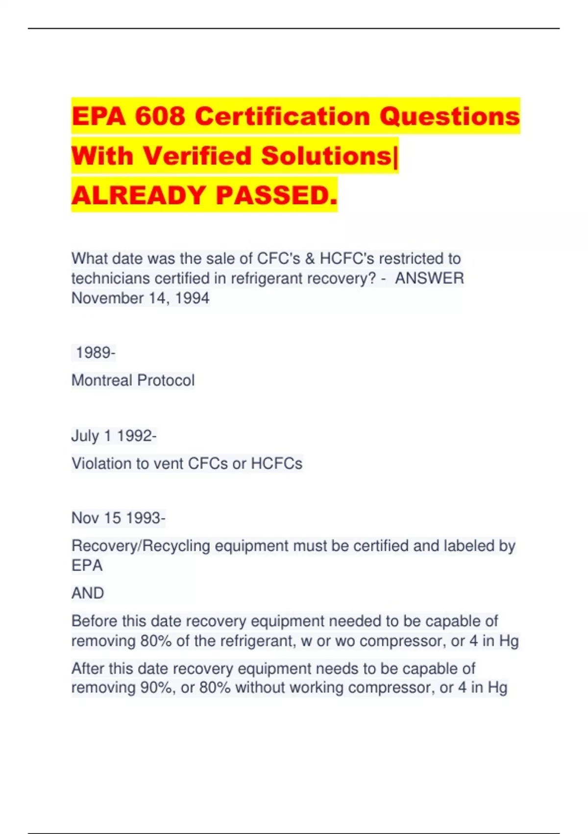 EPA 608 Certification Questions With Verified Solutions| ALREADY PASSED. What date was the sale of CFC's & HCFC's restricted to technicians certified in refrigerant recovery? - ANSWER November 14, 1994 1989- Montreal Protocol July 1 1992- Violation to vent CFCs or HCFCs Nov 15 1993- Recovery/Recycling equipment must be certified and labeled by EPA AND Before this date recovery equipment needed to be capable of removing 80% of the refrigerant, w or wo compressor, or 4 in Hg After this date recovery equipment needs to be capable of removing 90%, or 80% without working compressor, or 4 in Hg AND Required level of evacuation for Low Pressure appliances before this date was 25 inches Hg, after this date 25 mm Hg Nov 14 1994- Certification needed to service, maintain, or dispose of appliances with refrigerants AND Sale of CFC and HCFC refrigerants restricted to certified techs Nov 15 1995- Violation to vent HFCs Dec 31 1995- CFCs no longer produced - ANSWER Memorize it, ya'll. Comfort cooling appliances containing more than 50 lbs of refrigerant must be repaired when the annual leak rate exceeds _____% - ANSWER 15% Commercial and Industrial process refrigeration containing ore than 50 lbs of refrigerant must be repaired when the annual leak rate exceeds _____% - ANSWER 35% Required Recovery Levels for Type II appliances, before and after 11/15/93: HCFC22 less than 200 lbs = B4-0 After-0 HCFC22 more than 200 lbs= B4-4 After-10 NonHCFC22 less than 200 lbs= B4-4 After 10 NonHCFC22 more than 200 lbs= B4 4 After 15 Very high pressure appliances= B4-0 After-0 - ANSWER 0 0 4 10 4 10 4 15 0 0 Section 608 of the Federal Clean Air Act requires technicians to what? - ANSWER Recover all refrigerants. The objective of the Clean Air Act is to protect what? - ANSWER The earth's stratosphere. HFC's - ANSWER HydroFlouroCarbon's CFC's - ANSWER ChloroFluoroCarbon's ODP - ANSWER Ozone Depletion Potential Which international treaty agreement was the basis for Section 608? - ANSWER The Montreal Protocol. Depletion of the ozone in the stratosphere is known to cause what 6 things? - ANSWER 1.Crop losses 2.Increases in eye diseases 3.Skin Cancer 4.Reduced marine life 5.Deforestation 6.Increased ground level ozone