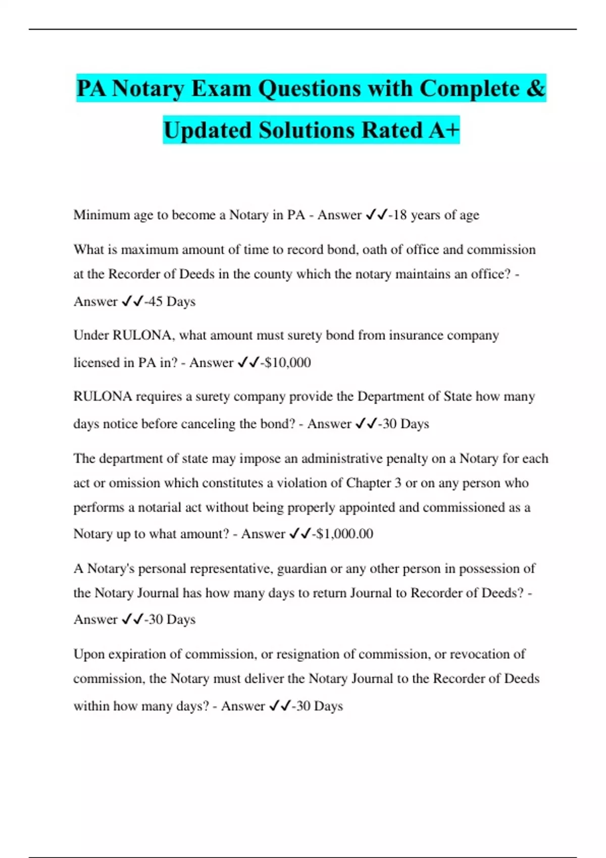Minimum age to become a Notary in PA - Answer ️️-18 years of age What is maximum amount of time to record bond, oath of office and commission at the Recorder of Deeds in the county which the notary maintains an office? -Answer ️️-45 Days Under RULONA, what amount must surety bond from insurance company licensed in PA in? - Answer ️️-$10,000