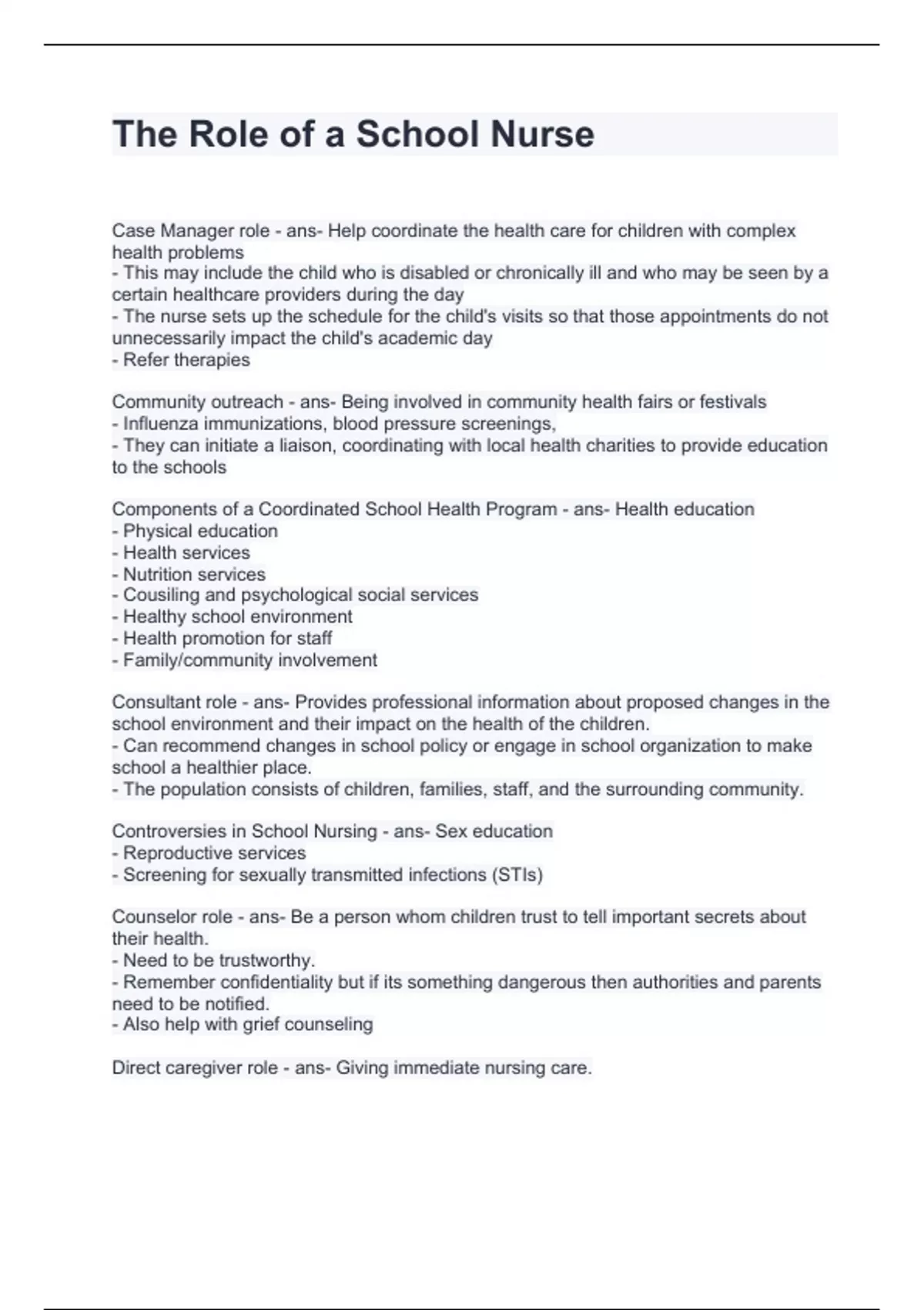 Case Manager role - ans- Help coordinate the health care for children with complex health problems - This may include the child who is disabled or chronically ill and who may be seen by a certain healthcare providers during the day - The nurse sets up the schedule for the child's visits so that those appointments do not unnecessarily impact the child's academic day - Refer therapies