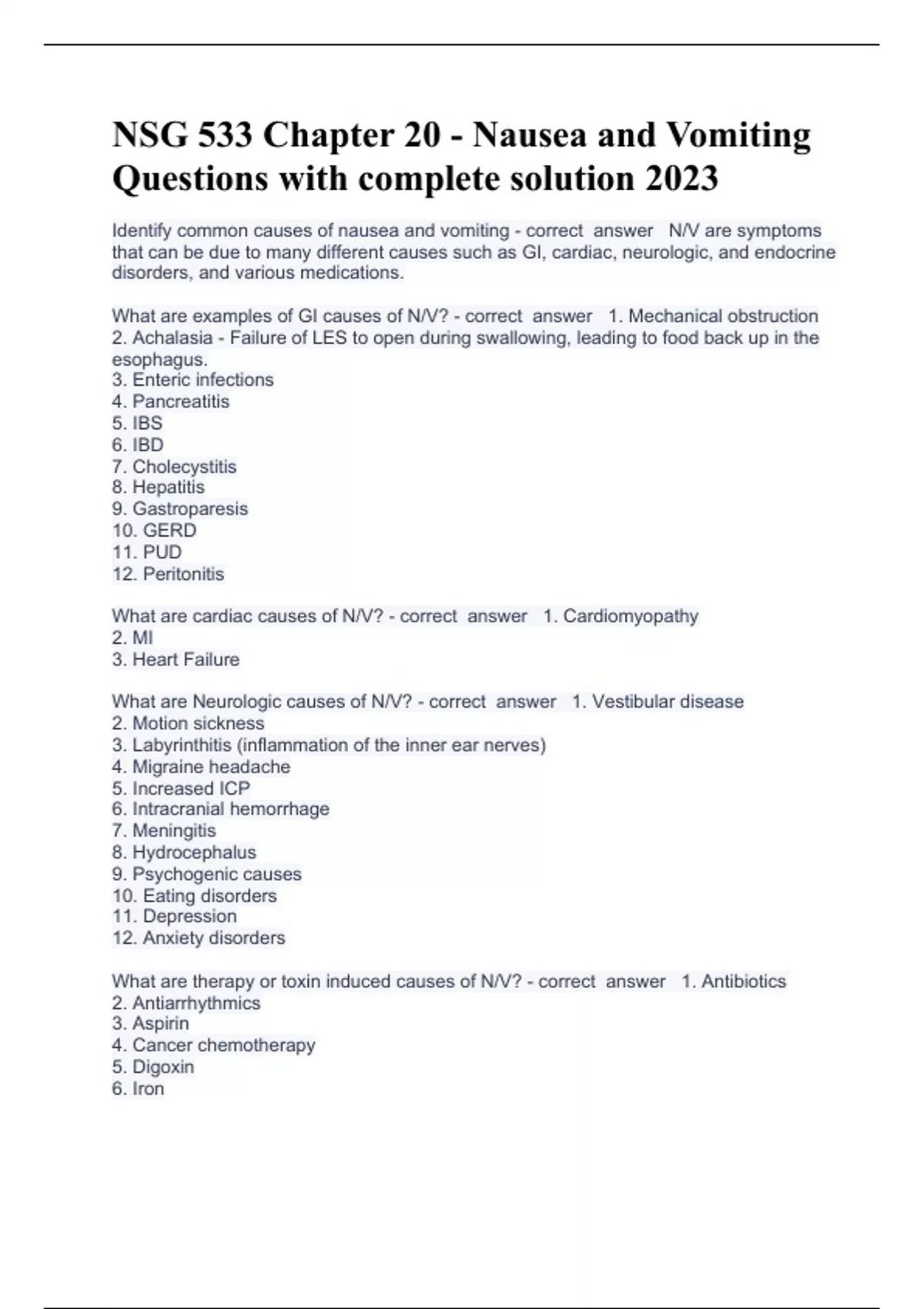 NSG 533 Chapter 20 - Nausea and Vomiting Questions with complete solution 2023/2024 What are cardiac causes of N/V? - correct answer 1. Cardiomyopathy 2. MI 3. Heart Failure What are Neurologic causes of N/V? - correct answer 1. Vestibular disease 2. Motion sickness 3. Labyrinthitis (inflammation of the inner ear nerves) 4. Migraine headache 5. Increased ICP 6. Intracranial hemorrhage 7. Meningitis 8. Hydrocephalus 9. Psychogenic causes 10. Eating disorders 11. Depression 12. Anxiety disorders What are therapy or toxin induced causes of N/V? - correct answer 1. Antibiotics 2. Antiarrhythmics 3. Aspirin 4. Cancer chemotherapy 5. Digoxin 6. Iron 7. Lead 8. Marijuana 9. Oral anti-diabetics 10. Oral contraceptives 11. Opioids 12. Anticonvulsants 13. Radiation therapy 14. Ethanol What are endocrine/metabolic causes of N/V? - correct answer 1. Pregnancy (NVP or hyperemesis gravidarum) 2. Uremia 3. Diabetic keto acidosis 4. Hyperthyroidism 5. Parathyroid disease 6. Addison disease Post-operative N/V risk factors - correct answer *Occurs in 30% of surgical patients overall and up to 70% of high-risk patients Risk Factors: 1. Female sex 2. History of motion sickness 3. History of PONV 4. Non-smoking status 5. Use of opioids post-operatively 6. Choice of anesthetic agents and duration of surgery may also contribute to PONV.