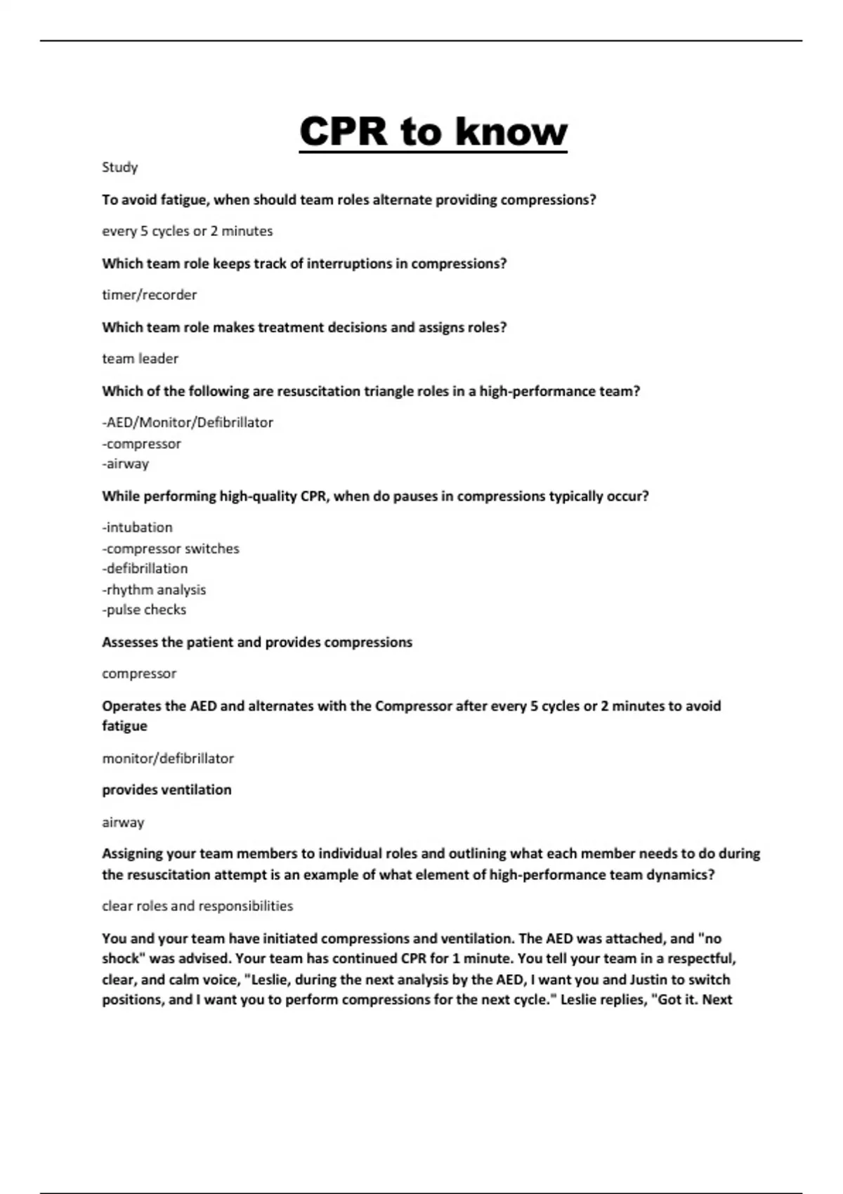 To avoid fatigue, when should team roles alternate providing compressions? every 5 cycles or 2 minutes Which team role keeps track of interruptions in compressions? timer/recorder Which team role makes treatment decisions and assigns roles? team leader Which of the following are resuscitation triangle roles in a high-performance team? -AED/Monitor/Defibrillator -compressor -airway While performing high-quality CPR, when do pauses in compressions typically occur? -intubation -compressor switches -defibrillation -rhythm analysis -pulse checks Assesses the patient and provides compressions compressor Operates the AED and alternates with the Compressor after every 5 cycles or 2 minutes to avoid fatigue monitor/defibrillator provides ventilation airway Assigning your team members to individual roles and outlining what each member needs to do during the resuscitation attempt is an example of what element of high-performance team dynamics? clear roles and responsibilities You and your team have initiated compressions and ventilation. The AED was attached, and "no shock" was advised. Your team has continued CPR for 1 minute. You tell your team in a respectful, clear, and calm voice, "Leslie, during the next analysis by the AED, I want you and Justin to switch positions, and I want you to perform compressions for the next cycle." Leslie replies, "Got it. Next time the AED analyzes, I will switch with Justin and assume the role of Compressor." This is an example of which element of high-performance team dynamics? closed-loop communication As Team Leader, you notice that your Compressor is pushing too fast. It is important to correct actions that are incorrect, but it is also important to be tactful when delivering this correction to a colleague. This is an example of what element of team dynamics? constructive intervention What action can you take as a team during and after a resuscitation attempt that helps individual team members perform better and brings awareness to system strengths and deficiencies? debriefing AED special considerations hairy chest, water, transdermal medicine patch, implanted defibrillator or pacemaker, defibrillation for infants less than 1 year of age Hairy chest -if your AED has 1 set of pads and a razor, quickly shave the area and then apply the pads -if your AED has 2 sets of pads, use the first set to remove the hair. Apply the first set of pads, press them down so they stick as much as possible, and quickly pull them off. Then apply the new, second set of pads Water -if someone is lying in water, quickly move the victim to a dry area; if the victim is lying is snow or a small puddle, use the AED -if the chest is covered with water or sweat, wipe the chest before attaching the pads Transdermal medicine patch -do not place the pad directly over a medicine patch -take the patch off and quickly wipe the chest before you put on the pad Implanted defibrillator or pacemaker -if you see a lump indicating a device, avoid placing the pad directly over it Defibrillation for infants less than 1 year of age -a manual defibrillator is preferred rather than an AED -if a manual defibrillator is not available, an AED with a pediatric does attenuator is preferred -if neither is available, you may use an AED without a pediatric dose attenuator What are examples of effective team dynamics? clear roles and responsibilities