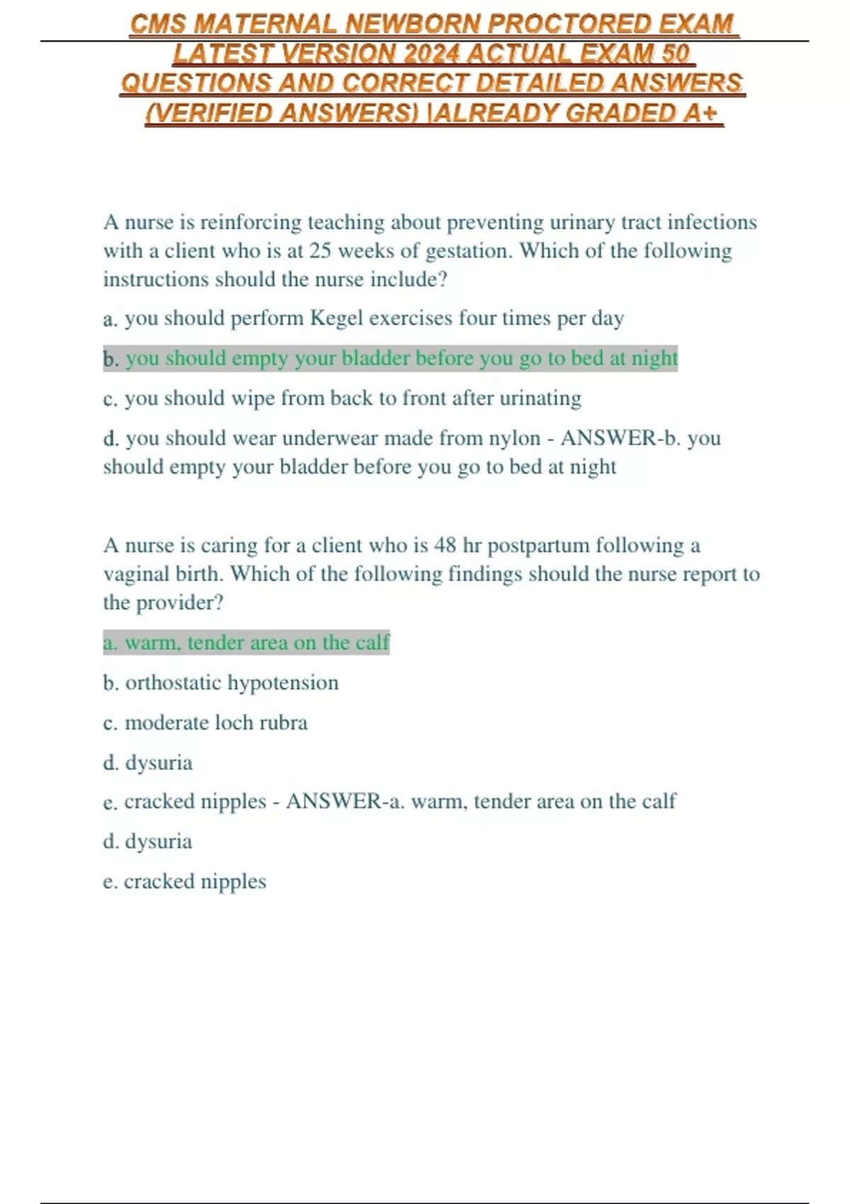CMS MATERNAL NEWBORN PROCTORED EXAM LATEST VERSION 2024 ACTUAL EXAM 50 QUESTIONS AND CORRECT DETAILED ANSWERS (VERIFIED ANSWERS) |ALREADY GRADED A+