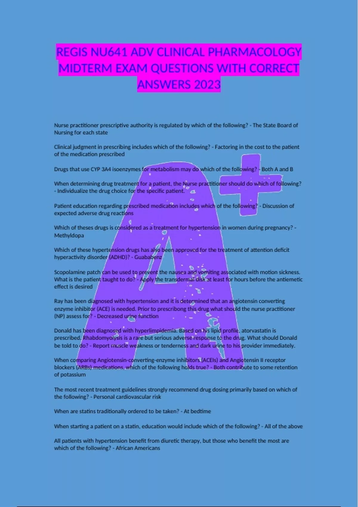 REGIS NU641 ADV CLINICAL PHARMACOLOGY MIDTERM EXAM QUESTIONS WITH CORRECT ANSWERS 2023