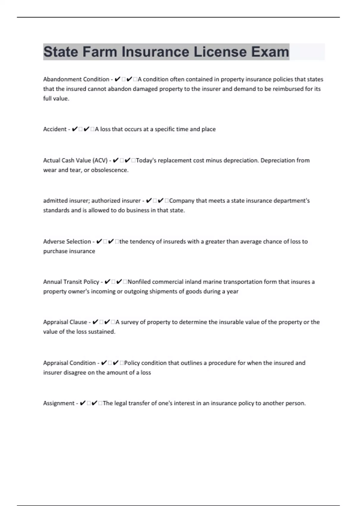 Abandonment Condition - ️️A condition often contained in property insurance policies that states that the insured cannot abandon damaged property to the insurer and demand to be reimbursed for its full value. Accident - ️️A loss that occurs at a specific time and place Actual Cash Value (ACV) - ️️Today's replacement cost minus depreciation. Depreciation from wear and tear, or obsolescence. admitted insurer; authorized insurer - ️️Company that meets a state insurance department's standards and is allowed to do business in that state. Adverse Selection - ️️the tendency of insureds with a greater than average chance of loss to purchase insurance Annual Transit Policy - ️️Nonfiled commercial inland marine transportation form that insures a property owner's incoming or outgoing shipments of goods during a year Appraisal Clause - ️️A survey of property to determine the insurable value of the property or the value of the loss sustained. Appraisal Condition - ️️Policy condition that outlines a procedure for when the insured and insurer disagree on the amount of a loss Assignment - ️️The legal transfer of one's interest in an insurance policy to another person.