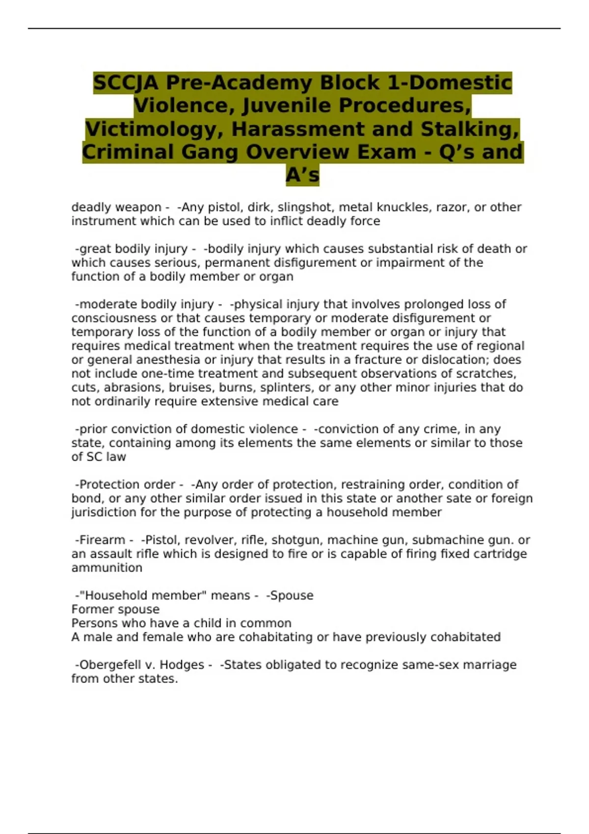 SCCJA Pre-Academy Block 1-Domestic Violence, Juvenile Procedures, Victimology, Harassment and Stalking, Criminal Gang Overview Exam - Q’s and A’s