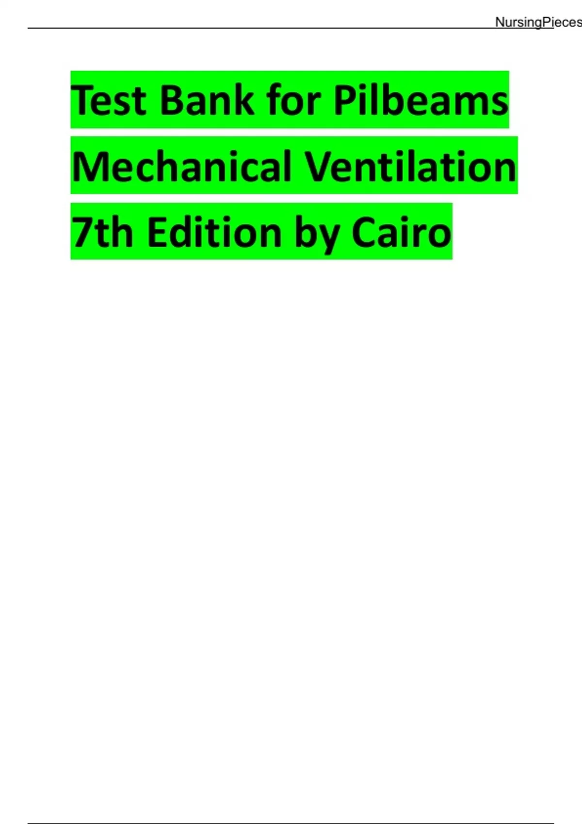 Test Bank for Pilbeams Mechanical Ventilation 7th Edition by Cairo Chapter 01: Basic Terms and Concepts of Mechanical Ventilation Cairo: Pilbeam’s Mechanical Ventilation: Physiological and Clinical Applications, 7th Edition MULTIPLE CHOICE 1. The body’s mechanism for conducting air in and out of the lungs is known as which of the following? a. External respiration b. Internal respiration c. Spontaneous ventilation d. Mechanical ventilation ANS: C The conduction of air in and out of the body is known as ventilation. Since the question asks for the body’s mechanism, this would be spontaneous ventilation. External respiration involves the exchange of oxygen (O 2 ) and carbon dioxide (CO ) between the alveoli and the pulmonary capillaries. Internal respiration occurs at the cellular level and involves movement of oxygen from the systemic blood into the cells. 2. Which of the following are involved in external respiration? a. Red blood cells and body cells b. Scalenes and trapezius muscles c. Alveoli and pulmonary capillaries d. External oblique and transverse abdominal muscles ANS: C External respiration involves the exchange of oxygen and carbon dioxide (CO ) between the alveoli and the pulmonary capillaries. Internal respiration occurs at the cellular level and involves movement of oxygen from the systemic blood into the cells. Scalene 2 and trapezius muscles are accessory muscles of inspiration. External oblique and transverse abdominal muscles are accessory muscles of expiration. 3. The graph that shows intrapleural pressure changes during normal spontaneous breathing is depicted by which of the following? a. b. c. d. ANS: B During spontaneous breathing, the intrapleural pressure drops from about −5 cm H 2 . 1 2 O at end-expiration to about −10 cm H O at end-inspiration. The graph depicted for answer B shows that change from −5 cm H 4. During spontaneous inspiration alveolar pressure (P a. −1 cm H b. +1 cm H c. 0 cm H d. 5 cm H ANS: A 2 2 2 O 2 O O O A ) is about ________________. During normal spontaneous ventilation alveolar pressure will become −1 cm H 2 2 O to −10 cm H 2 O. O which is the lowest. During the exhalation of a normal spontaneous breath the alveolar pressure will become +1 cm H 2 O. 2 5. The pressure required to maintain alveolar inflation is known as which of the following? a. Transairway pressure (P b. Transthoracic pressure (P c. Transrespiratory pressure (P d. Transpulmonary pressure (P ANS: D TA ) TT ) TR L ) ) The definition of transpulmonary pressure (P L ) is the pressure required to maintain alveolar inflation. Transairway pressure (P ) is the pressure gradient required to produce airflow in the conducting tubes. Transrespiratory pressure (P ) is the pressure to inflate the lungs and airways during positive-pressure ventilation. Transthoracic pressure (P TT TR ) represents the pressure required to expand or contract the lungs and the chest wall at the same time. 6. Calculate the pressure needed to overcome airway resistance during positive-pressure ventilation when the proximal airway pressure (P a. 7 cm H b. 30 cm H c. 40 cm H awo d. 175 cm H ANS: B 2 O 2 2 ) is 35 cm H O O 2 O The transairway pressure (P 2 O and the alveolar pressure (P TA A ) is 5 cm H 2 O. ) is used to calculate the pressure required to overcome airway resistance during mechanical ventilation. This formula is P TA = P awo − P A. 7. The term used to describe the tendency of a structure to return to its original form after being stretched or acted on by an outside force is which of the following? a. Elastance b. Compliance c. Viscous resistance d. Distending pressure ANS: A The elastance of a structure is the tendency of that structure to return to its original shape after being stretched. The more elastance a structure has, the more difficult it is to stretch. The compliance of a structure is the ease with which the structure distends or stretches. Compliance is the opposite of elastance. Viscous resistance is the opposition to movement offered by adjacent structures such as the lungs and their adjacent organs. Distending pressure is pressure required to maintain inflation, for example, alveolar distending pressure. 8. Calculate the pressure required to achieve a tidal volume of 400 mL for an intubated patient with a respiratory system compliance of 15 mL/cm H a. 6 cm H 2 b. 26.7 cm H c. 37.5 cm H d. 41.5 cm H ANS: B O 2 2 2 2 O. O O O ΔC = ΔV/ΔP then ΔP = ΔV/ΔC 9. Which of the following conditions causes pulmonary compliance to increase? a. Asthma b. Kyphoscoliosis c. Emphysema d. Acute respiratory distress syndrome (ARDS) ANS: C Emphysema causes an increase in pulmonary compliance, whereas ARDS and kyphoscoliosis cause decreases in pulmonary compliance. Asthma attacks cause increase in airway resistance. 10. Calculate the effective static compliance (C ) given the following information about a patient receiving mechanical ventilation: peak inspiratory pressure (PIP) is 56 cm H 2 s O, plateau pressure (P plat ) is 40 cm H 2 O, exhaled tidal volume (V ) is 650 mL, and positive end-expiratory pressure (PEEP) is 10 cm H a. 14.1 mL/cm H b. 16.3 mL/cm H c. 21.7 mL/cm H d. 40.6 mL/cm H ANS: C 2 2 2 2 O O O O The formula for calculating effective static compliance is C 2 O. s = V T /(P plat − EEP). 11. Based upon the following patient information, calculate the patient’s static lung compliance: exhaled tidal volume (V peak inspiratory pressure (PIP) is 28 cm H a. 0.02 L/cm H b. 0.03 L/cm H c. 0.22 L/cm H d. 0.34 L/cm H ANS: C 2 2 2 2 O O O O 2 O, plateau pressure (P The formula for calculating effective static compliance is C s = V T plat ) is 8 cm H /(P plat − EEP). 2 O, and PEEP is set at 5 cm H . 2 T 2 O. T TA ) is 675 mL, 12. A patient receiving mechanical ventilation has an exhaled tidal volume (V ) of 500 mL and a positive end-expiratory pressure setting (PEEP) of 5 cm H O. Patient-ventilator system checks reveal the following data: Time PIP (cm H 2 2 O) P plat 