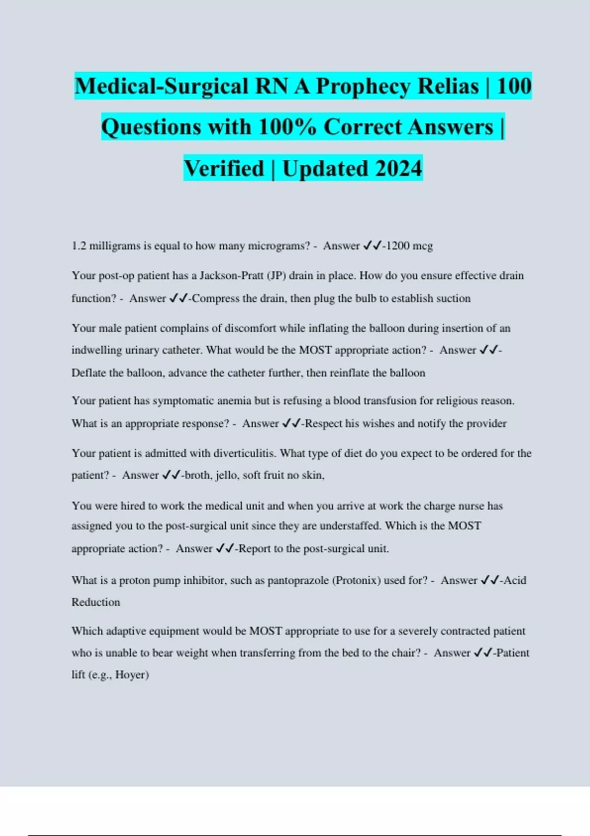Medical-Surgical RN A Prophecy Relias | 100 Questions with 100% Correct Answers | Verified | Updated 2024