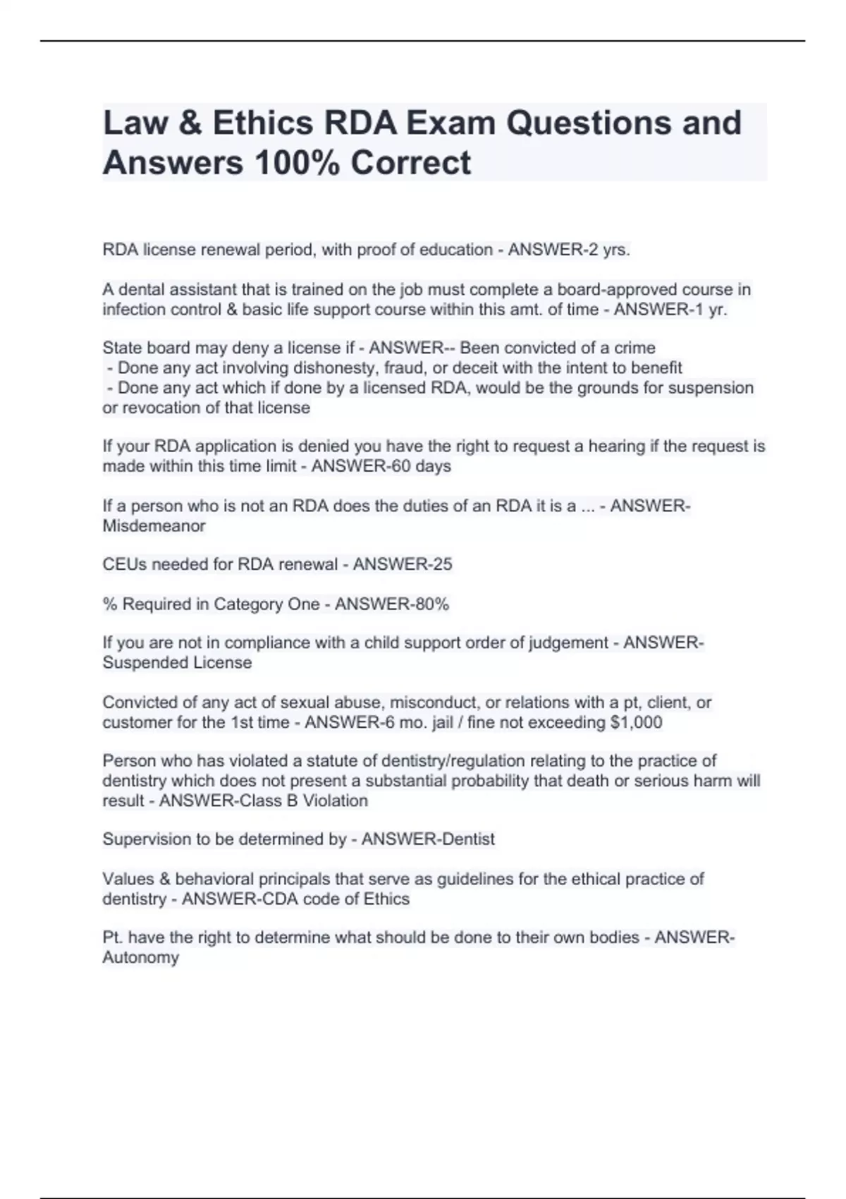 Law & Ethics RDA Exam Questions and Answers 100% CorrectLaw & Ethics RDA Exam Questions and Answers 100% CorrectLaw & Ethics RDA Exam Questions and Answers 100% Correct RDA license renewal period, with proof of education - ANSWER-2 yrs. A dental assistant that is trained on the job must complete a board-approved course in infection control & basic life support course within this amt. of time - ANSWER-1 yr. State board may deny a license if - ANSWER-- Been convicted of a crime - Done any act involving dishonesty, fraud, or deceit with the intent to benefit - Done any act which if done by a licensed RDA, would be the grounds for suspension or revocation of that license If your RDA application is denied you have the right to request a hearing if the request is made within this time limit - ANSWER-60 days