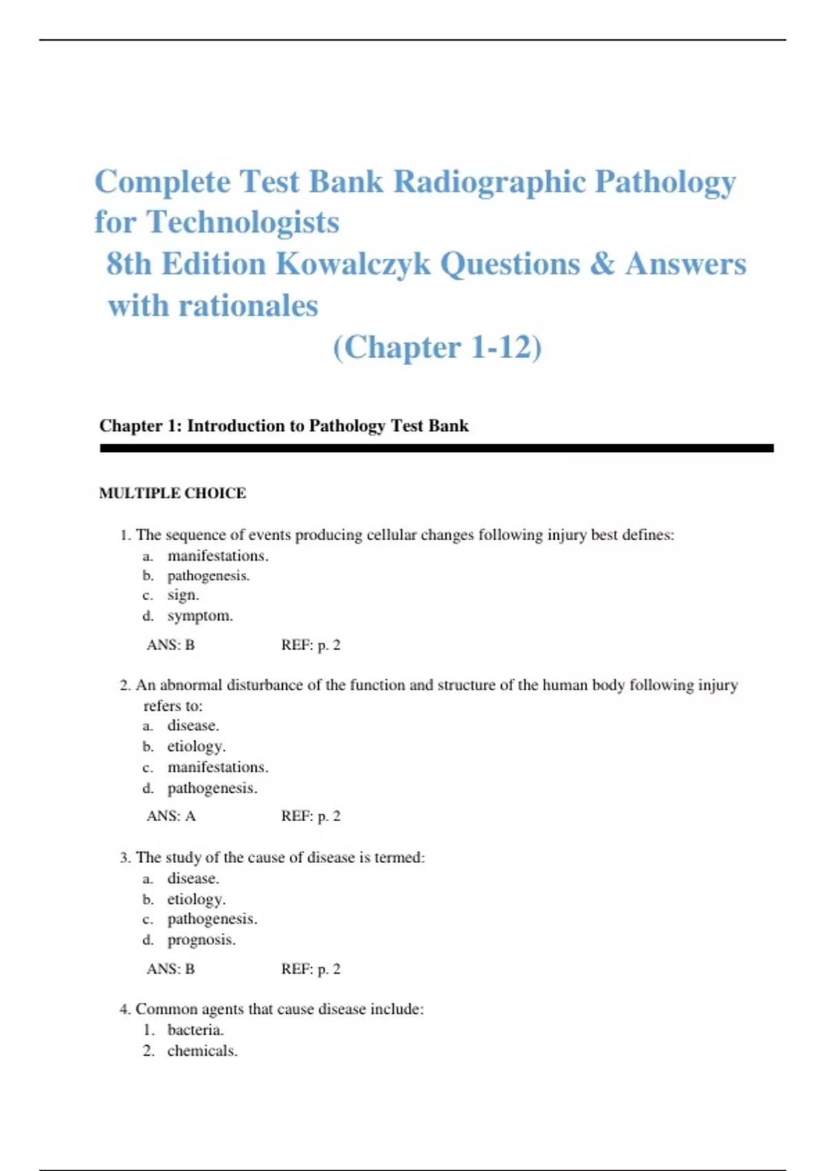 Complete Test Bank Radiographic Pathology for Technologists 8th Edition Kowalczyk Questions & Answers with rationales (Chapter 1-12) Chapter 1: Introduction to Pathology Test Bank MULTIPLE CHOICE 1. The sequence of events producing cellular changes following injury best defines: a. manifestations. b. pathogenesis. c. sign. d. symptom. ANS: B REF: p. 2 2. An abnormal disturbance of the function and structure of the human body following injury refers to: a. disease. b. etiology. c. manifestations. d. pathogenesis. ANS: A REF: p. 2 3. The study of the cause of disease is termed: a. disease. b. etiology. c. pathogenesis. d. prognosis. ANS: B REF: p. 2 4. Common agents that cause disease include: 1. bacteria. 2. chemicals. 3. heat. a. 1 and 2 only b. 1 and 3 only c. 2 and 3 only d. 1, 2, and 3 ANS: D REF: p. 2