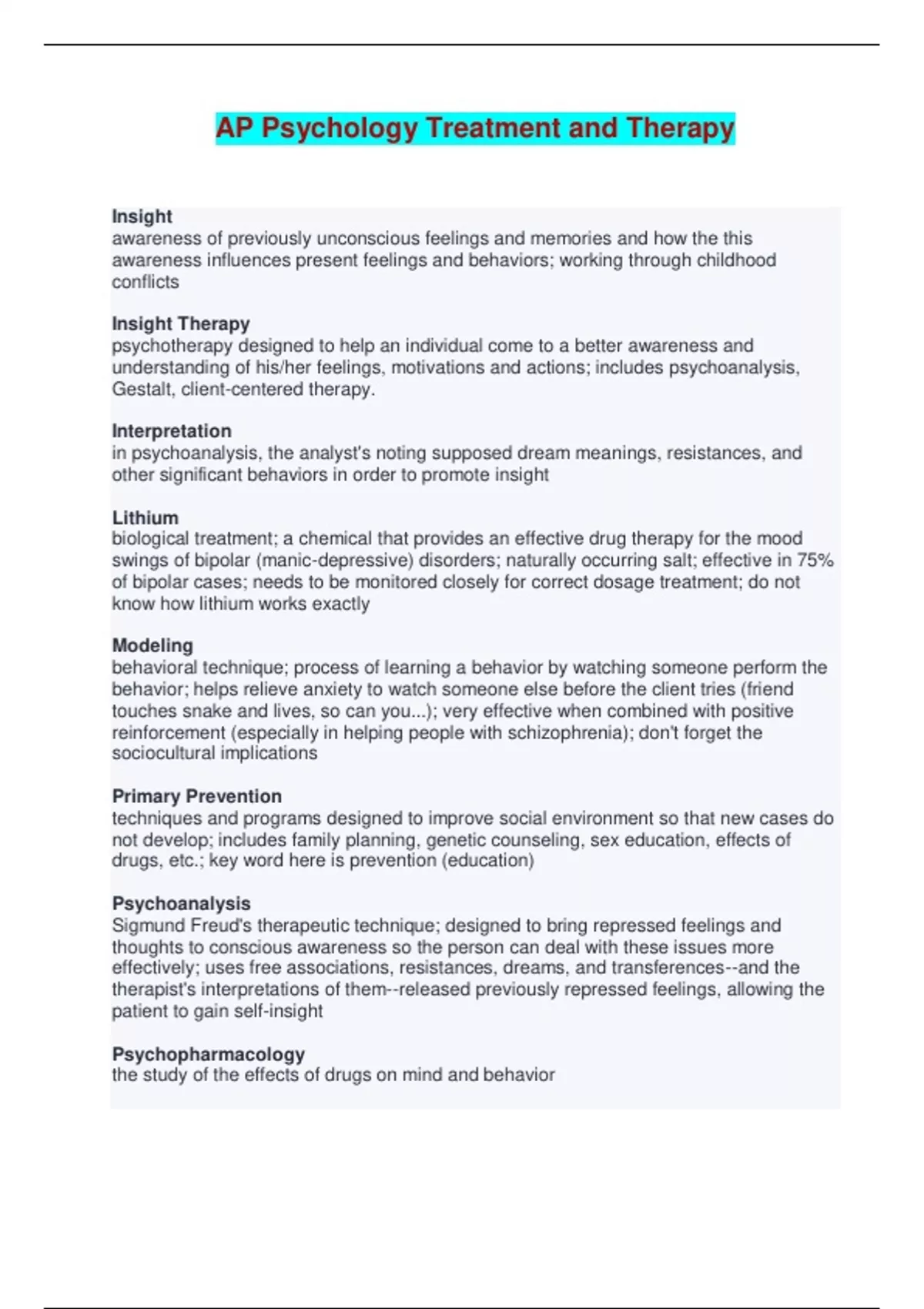 AP Psychology Treatment and Therapy Terminology Insight awareness of previously unconscious feelings and memories and how the this awareness influences present feelings and behaviors; working through childhood conflicts Insight Therapy psychotherapy designed to help an individual come to a better awareness and understanding of his/her feelings, motivations and actions; includes psychoanalysis, Gestalt, client-centered therapy. Interpretation in psychoanalysis, the analyst's noting supposed dream meanings, resistances, and other significant behaviors in order to promote insight Lithium biological treatment; a chemical that provides an effective drug therapy for the mood swings of bipolar (manic-depressive) disorders; naturally occurring salt; effective in 75% of bipolar cases; needs to be monitored closely for correct dosage treatment; do not know how lithium works exactly Modeling behavioral technique; process of learning a behavior by watching someone perform the behavior; helps relieve anxiety to watch someone else before the client tries (friend touches snake and lives, so can you...); very effective when combined with positive reinforcement (especially in helping people with schizophrenia); don't forget the sociocultural implications Primary Prevention techniques and programs designed to improve social environment so that new cases do not develop; includes family planning, genetic counseling, sex education, effects of drugs, etc.; key word here is prevention (education) Psychoanalysis Sigmund Freud's therapeutic technique; designed to bring repressed feelings and thoughts to conscious awareness so the person can deal with these issues more effectively; uses free associations, resistances, dreams, and transferences--and the therapist's interpretations of them--released previously repressed feelings, allowing the patient to gain self-insight Psychopharmacology the study of the effects of drugs on mind and behavior Psychostimulants biological treatment; heightens alertness and arousal; commonly used to treat AD/HD case because they increase the electrical activity of the frontal lobe and therefore cause a calming effect rather than stimulating; includes Ritalin Psychosurgery biological treatment; brain surgery to change a person's behavior; includes a prefrontal lobotomy; rarely used today Psychotherapy the use of psychological techniques to treat disorder; can take many forms (group, individual, family, couples, etc)