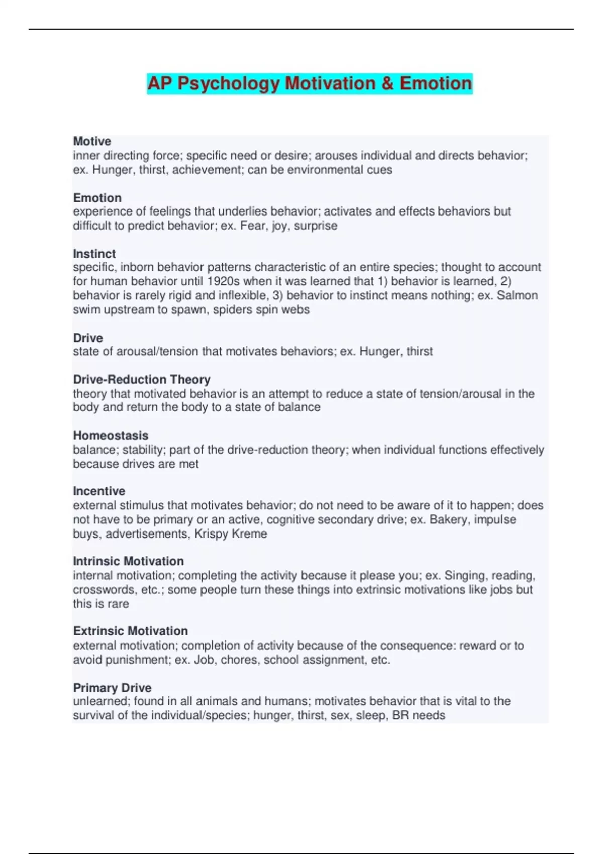 AP Psychology Motivation & Emotion Terminology Motive inner directing force; specific need or desire; arouses individual and directs behavior; ex. Hunger, thirst, achievement; can be environmental cues Emotion experience of feelings that underlies behavior; activates and effects behaviors but difficult to predict behavior; ex. Fear, joy, surprise Instinct specific, inborn behavior patterns characteristic of an entire species; thought to account for human behavior until 1920s when it was learned that 1) behavior is learned, 2) behavior is rarely rigid and inflexible, 3) behavior to instinct means nothing; ex. Salmon swim upstream to spawn, spiders spin webs Drive state of arousal/tension that motivates behaviors; ex. Hunger, thirst Drive-Reduction Theory theory that motivated behavior is an attempt to reduce a state of tension/arousal in the body and return the body to a state of balance Homeostasis balance; stability; part of the drive-reduction theory; when individual functions effectively because drives are met Incentive external stimulus that motivates behavior; do not need to be aware of it to happen; does not have to be primary or an active, cognitive secondary drive; ex. Bakery, impulse buys, advertisements, Krispy Kreme Intrinsic Motivation internal motivation; completing the activity because it please you; ex. Singing, reading, crosswords, etc.; some people turn these things into extrinsic motivations like jobs but this is rare Extrinsic Motivation external motivation; completion of activity because of the consequence: reward or to avoid punishment; ex. Job, chores, school assignment, etc. Primary Drive unlearned; found in all animals and humans; motivates behavior that is vital to the survival of the individual/species; hunger, thirst, sex, sleep, BR needs