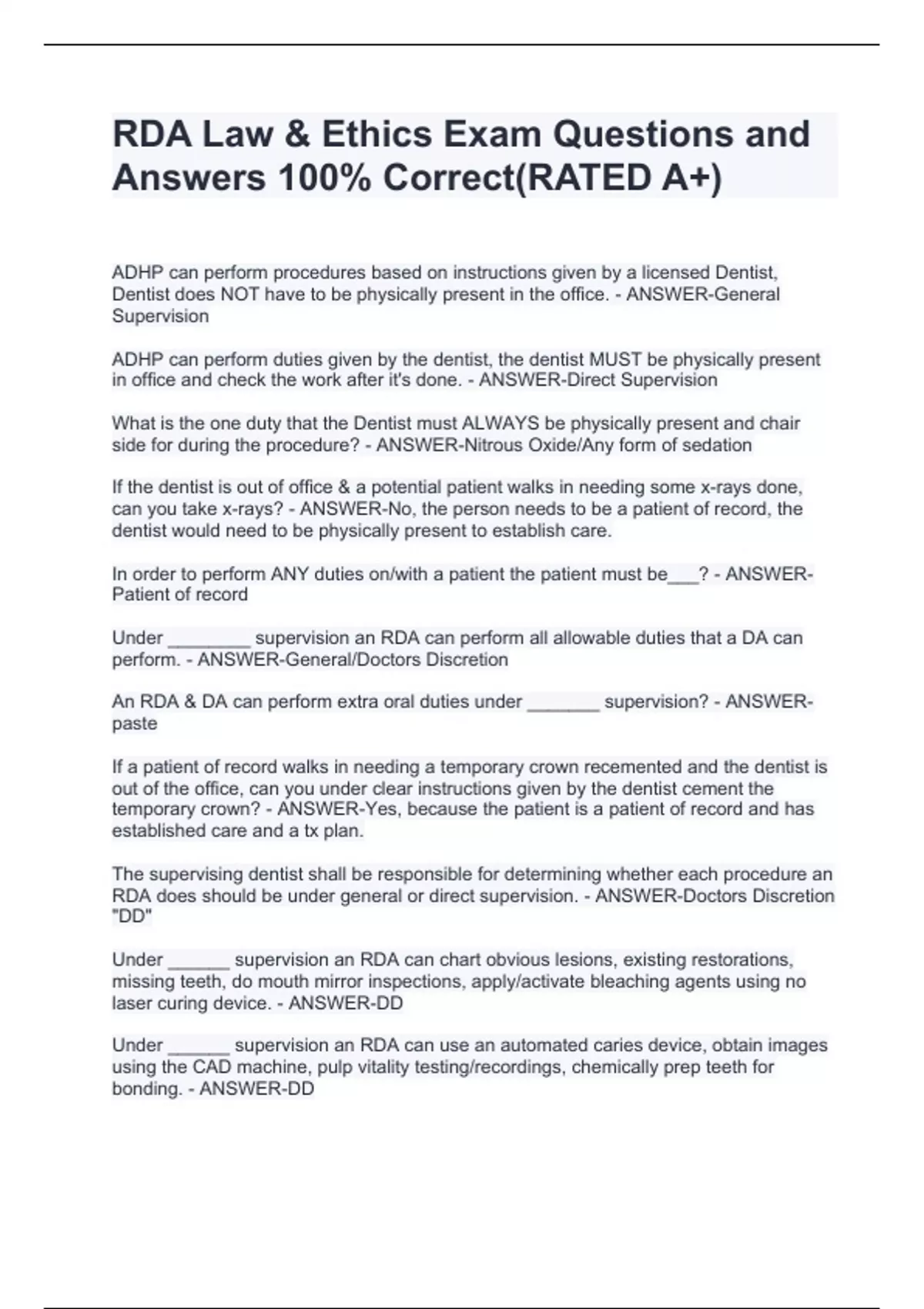 RDA Law & Ethics Exam Questions and Answers 100% Correct(RATED A+) RDA Law & Ethics Exam Questions and Answers 100% Correct(RATED A+) RDA Law & Ethics Exam Questions and Answers 100% Correct(RATED A+) RDA Law & Ethics Exam Questions and Answers 100% Correct(RATED A+) RDA Law & Ethics Exam Questions and Answers 100% Correct(RATED A+) RDA Law & Ethics Exam Questions and Answers 100% Correct(RATED A+) RDA Law & Ethics Exam Questions and Answers 100% Correct(RATED A+) RDA Law & Ethics Exam Questions and Answers 100% Correct(RATED A+) RDA Law & Ethics Exam Questions and Answers 100% Correct(RATED A+) RDA Law & Ethics Exam Questions and Answers 100% Correct(RATED A+)
