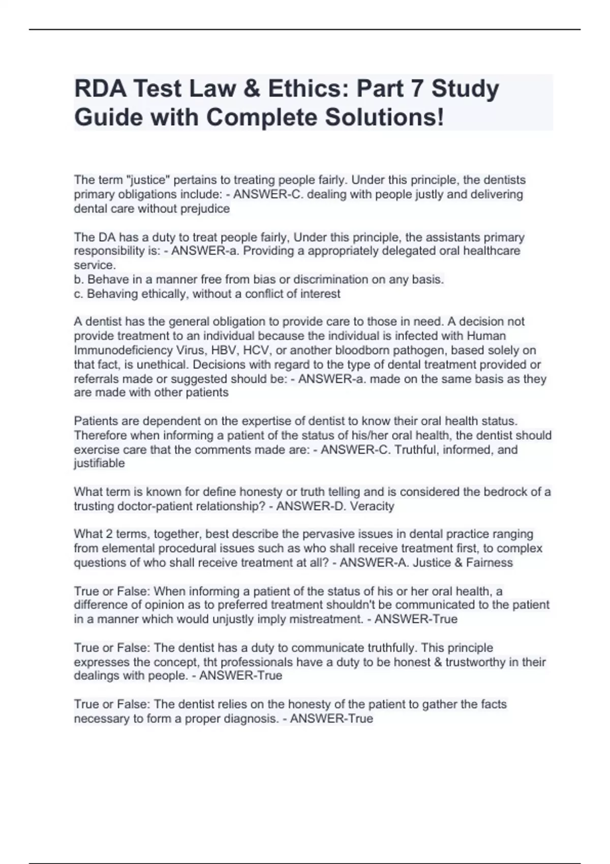 RDA Test Law & Ethics: Part 7 Study Guide with Complete Solutions!