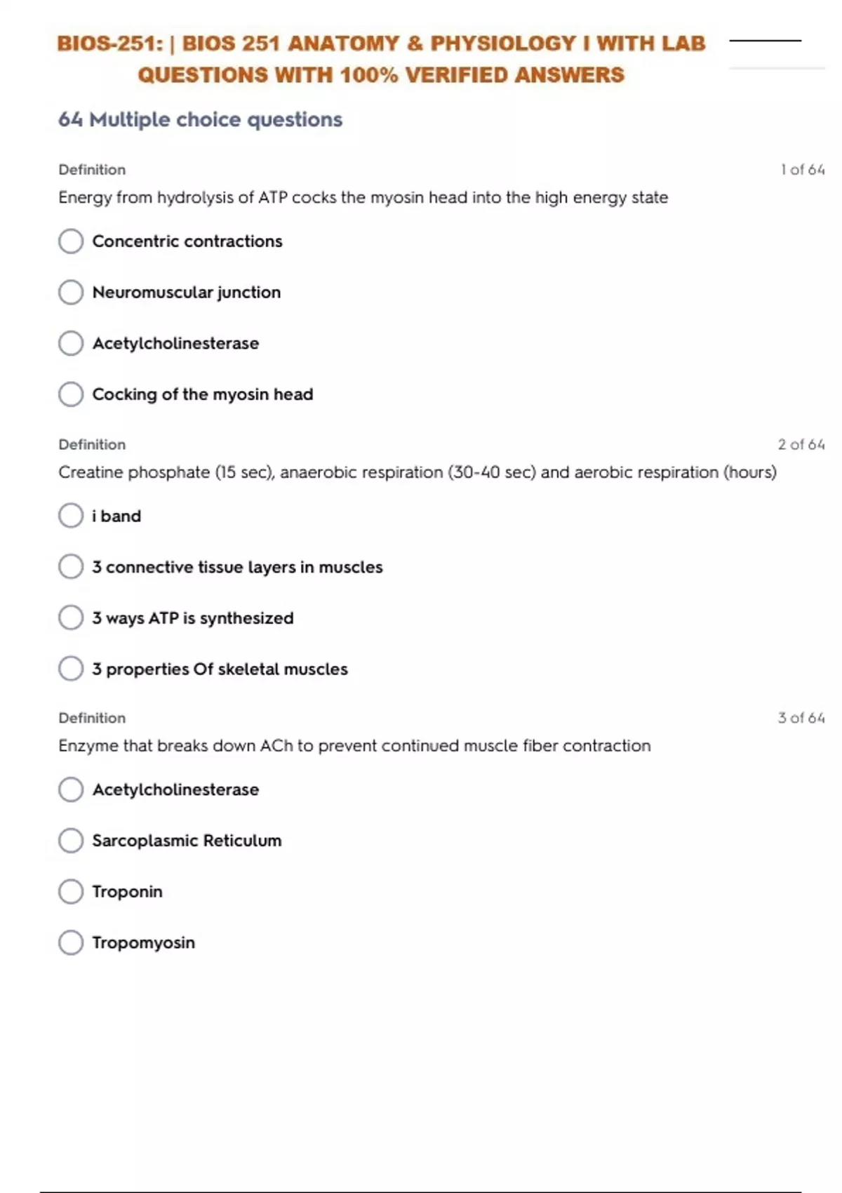 BIOS 251 ANATOMY & PHYSIOLOGY I MUSCLES AND MUSCLE TISSUE EXAM WITH 100% CORRECT MARKING SCHEME /VERIFIED ANSWERS
