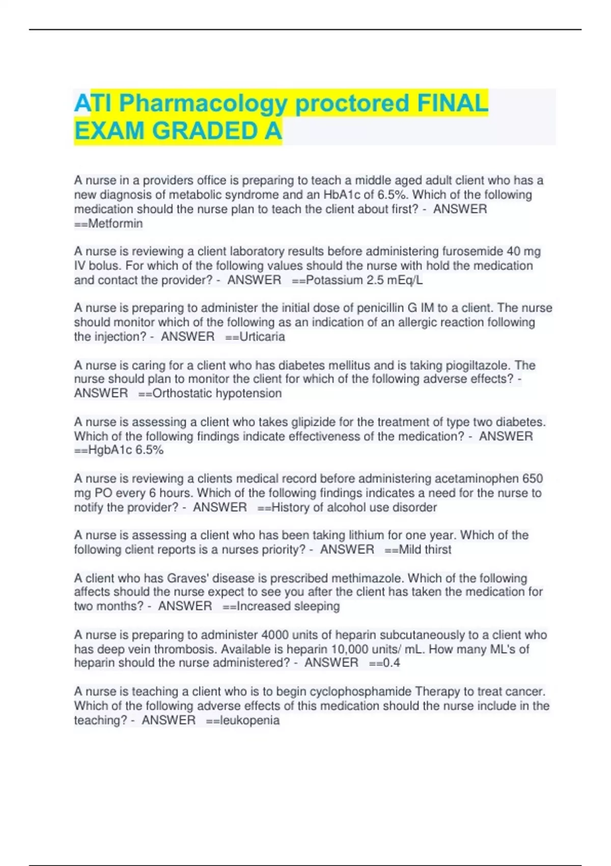 ATI Pharmacology proctored FINAL EXAM GRADED A ATI Pharmacology proctored FINAL EXAM GRADED A