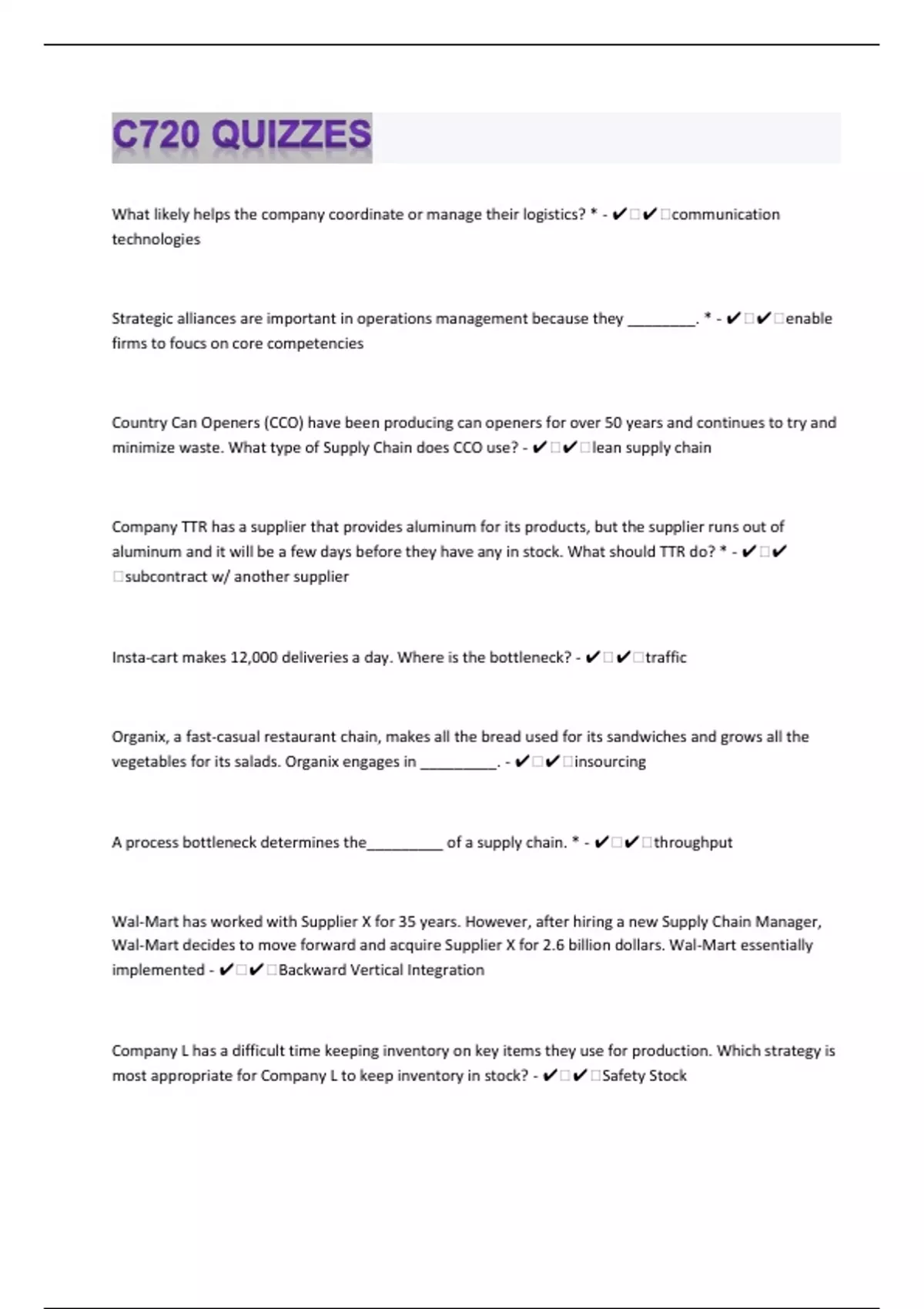 What likely helps the company coordinate or manage their logistics? * - ️️communication technologies Strategic alliances are important in operations management because they ________. * - ️️enable firms to foucs on core competencies Country Can Openers (CCO) have been producing can openers for over 50 years and continues to try and minimize waste. What type of Supply Chain does CCO use? - ️️lean supply chain Company TTR has a supplier that provides aluminum for its products, but the supplier runs out of aluminum and it will be a few days before they have any in stock. What should TTR do? * - ️️subcontract w/ another supplier Insta-cart makes 12,000 deliveries a day. Where is the bottleneck? - ️️traffic Organix, a fast-casual restaurant chain, makes all the bread used for its sandwiches and grows all the vegetables for its salads. Organix engages in _________. - ️️insourcing A process bottleneck determines the_________ of a supply chain. * - ️️throughput Wal-Mart has worked with Supplier X for 35 years. However, after hiring a new Supply Chain Manager, Wal-Mart decides to move forward and acquire Supplier X for 2.6 billion dollars. Wal-Mart essentially implemented - ️️Backward Vertical Integration Company L has a difficult time keeping inventory on key items they use for production. Which strategy is most appropriate for Company L to keep inventory in stock? - ️️Safety Stock