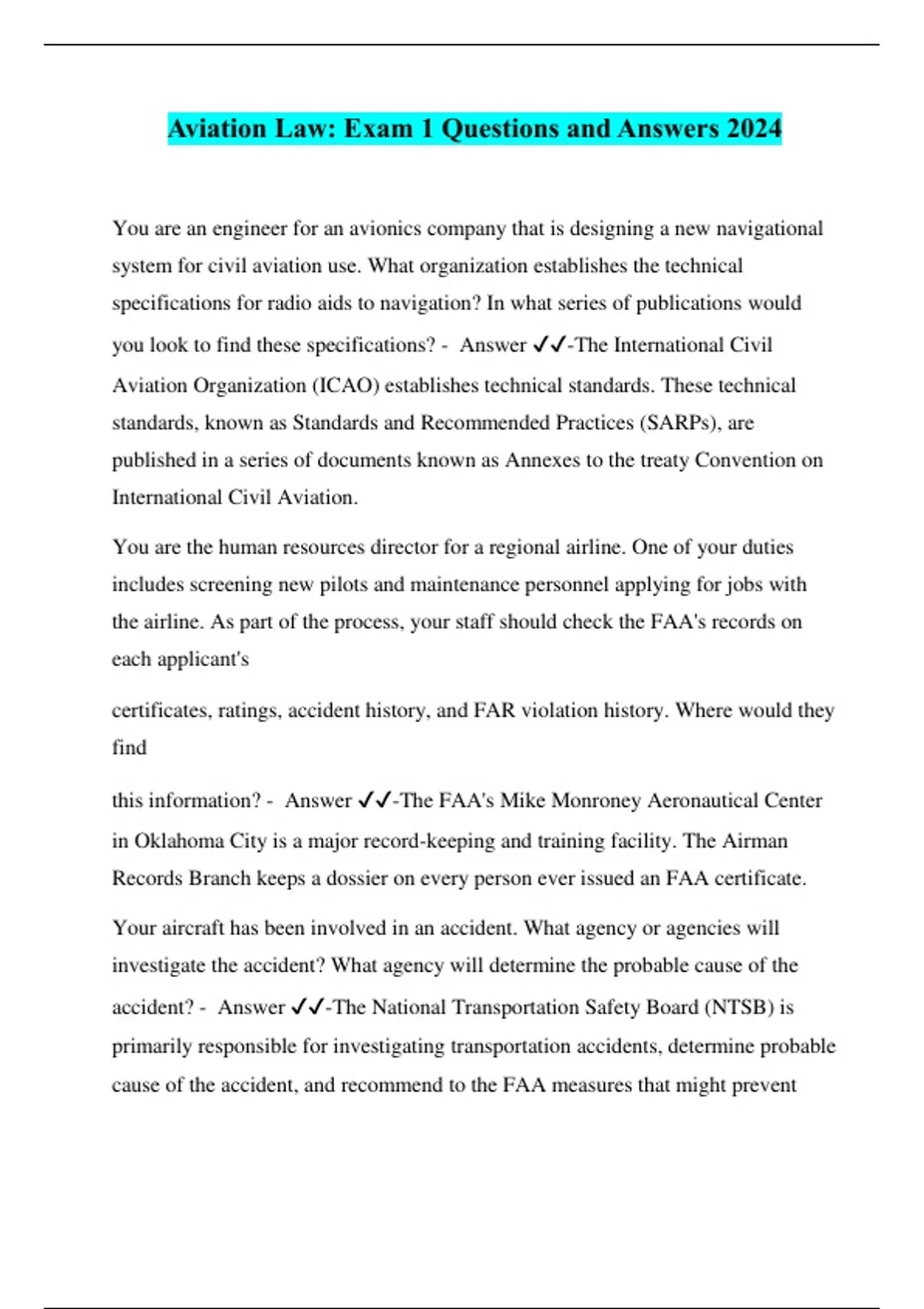 aviation law exam 1 questions and answers 2024