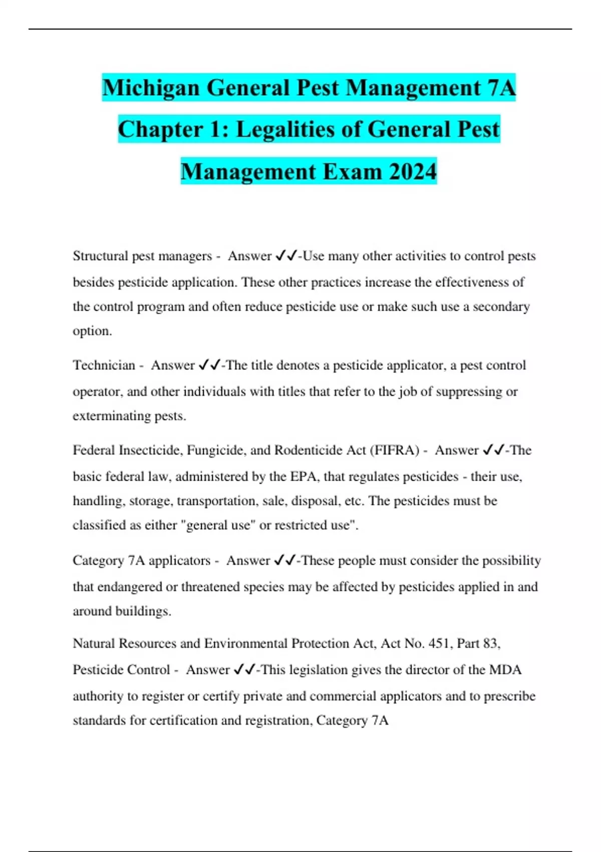 Michigan General Pest Management 7A Chapter 1: Legalities of General Pest Management Exam 2024