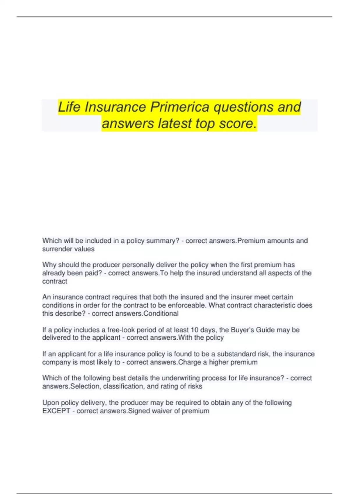 Life Insurance Primerica questions and answers latest top score. Which will be included in a policy summary? - correct answers.Premium amounts and surrender values Why should the producer personally deliver the policy when the first premium has already been paid? - correct answers.To help the insured understand all aspects of the contract An insurance contract requires that both the insured and the insurer meet certain conditions in order for the contract to be enforceable. What contract characteristic does this describe? - correct answers.Conditional If a policy includes a free-look period of at least 10 days, the Buyer's Guide may be delivered to the applicant - correct answers.With the policy If an applicant for a life insurance policy is found to be a substandard risk, the insurance company is most likely to - correct answers.Charge a higher premium Which of the following best details the underwriting process for life insurance? - correct answers.Selection, classification, and rating of risks Upon policy delivery, the producer may be required to obtain any of the following EXCEPT - correct answers.Signed waiver of premium Which of the following is a risk classification used by underwriters for insurance? - correct answers.Standard Which of the following documents delivered to the policy owner includes information about premium amounts, cash values, surrender values, and death benefits for specific policy years? - correct answers.A policy summary When both parties to a contract must perform certain duties and follow rules of conduct to make the contract enforceable, the contract is - correct answers.Conditional Representations are written or oral statements made by the applicant that are - correct answers.Considered true to the best of the applicant's knowledge Most agents try to collect the initial premium for submission with the application. When an agent collects the initial premium from the applicant, the agent should issue the applicant a - correct answers.Premium receipt All of the following are duties and responsibilities of producers at the time of application EXCEPT - correct answers.Change any incorrect statement on the application by personally initialing next to the corrected statement (must be initialed by the applicant) In insurance policies, the insured is not legally bound to any particular action in the insurance contract, but the insurer is legally obligated to pay losses covered by the policy. What contract element does this describe? - correct answers.Unilateral An insurer neglects to pay a legitimate claim that is covered under the terms of the policy. Which of the following insurance principles has the insurer violated? - correct answers.Consideration Which of the following is TRUE regarding the premium in term policies? - correct answers.The premium is level Which of the following terms best describe the coverage provided by term policies, as compared to any other form of protection? - correct answers.Greatest Which of the following types of insurance policies would provide the greatest amount of protection for a temporary period during which an insured will have limited financial resources? - correct answers.Term A Return of Premium term life policy is written as what type of term coverage? - correct answers.Increasing All of the following are true regarding a decreasing term policy EXCEPT - correct answers.The payable premium amount steadily declines throughout the duration of the contract What does "level" refer to in level term insurance? - correct answers.Face amount Which best describes annually renewable term insurance? - correct answers.It is level term insurance What characteristic makes whole life permanent protection? - correct answers.Coverage until death or age 100 Which of the following types of policies will provide permanent protection? - correct answers.Whole life A Straight Life policy has what type of premium? - correct answers.A level annual premium for the life of the insured Which statement is NOT true regarding a Straight Life Policy? - correct answers.It's premium steadily decreases over time, in response to its growing cash value Which of the following policies would be classified as a traditional level premium contract? - correct answers.Straight Life An insurance policy that only requires a payment of premium at its inception, provides insurance protection for the life of the insured, and matures at the insured's age of 100 is called - correct answers.Single premium whole life Your client wants both protection and savings from the insurance, and is willing to pay premiums until retirement at age 65. What would be the right policy for this client? - correct answers.Limited pay whole life Which statement is NOT true regarding a Straight Life policy? - correct answers.It's premium steadily decreases over time, in response to its growing cash value Under a 20-pay whole life policy, in order for the policy to pay the death benefit to a beneficiary, the premiums must be paid - correct answers.For 20 years or until death, whichever occurs first An insured owns a life insurance policy. To be able to pay some of her medical bills, she withdraws a portion of the policy's cash value. There is a limit for a withdrawal and the insurer charges a fee. What type of policy does the insured most likely have? - correct answers.Universal life The death protection component of Universal Life Insurance is always - correct answers.Annually Renewable Term The policy owner of a Universal Life Policy may skip paying the premium and the policy will not lapse as long as - correct answers.The policy contains sufficient cash value to cover the cost of insurance Which of the following policies would have an IRS required corridor or gap between the cash value and the death benefit? - correct answers.Universal Life- Option A The death benefit under the Universal Life Option B - correct answers.Gradually increases each year by the amount that the cash value increases W