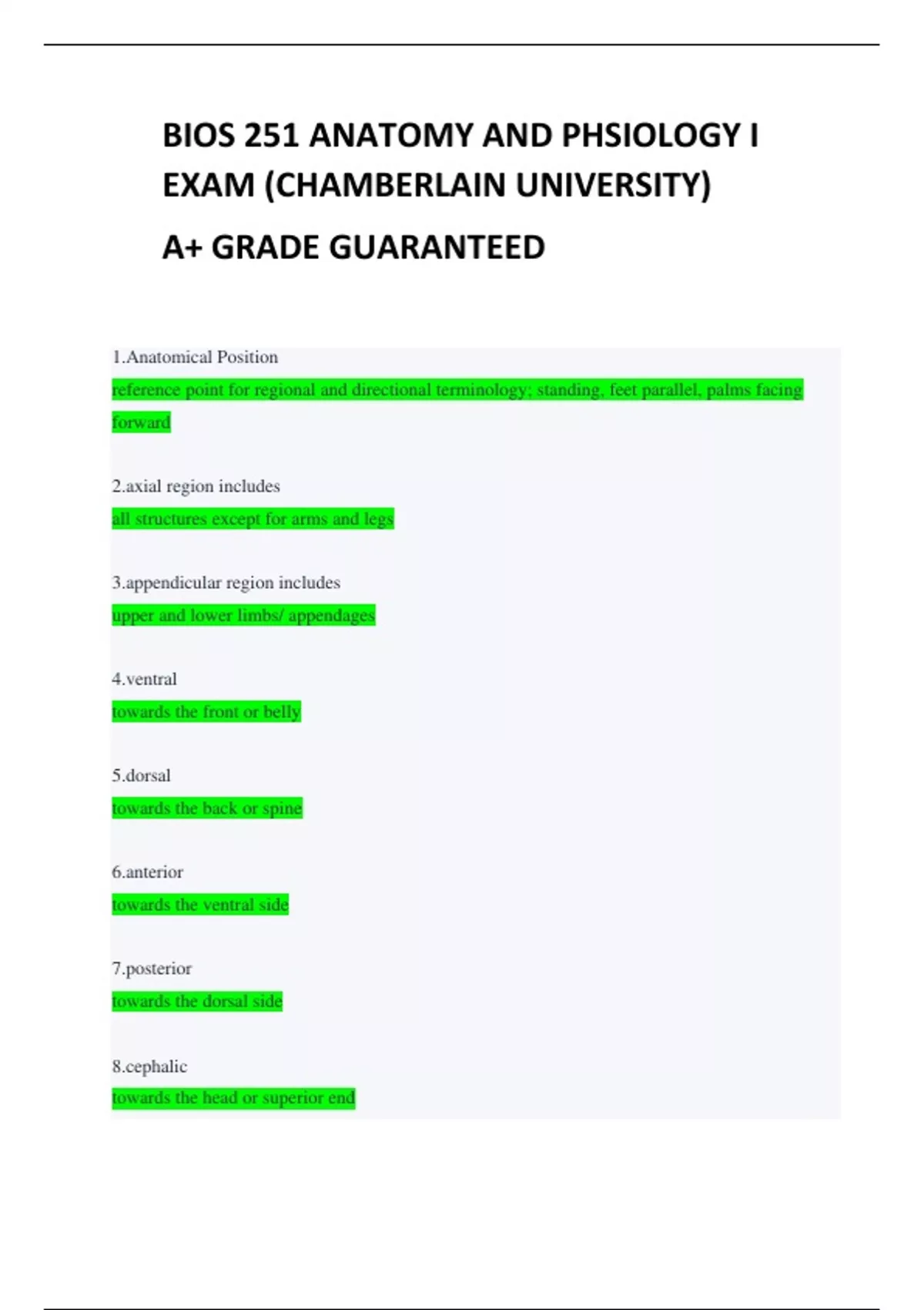 BIOS 251 ANATOMY AND PHSIOLOGY I EXAM (CHAMBERLAIN UNIVERSITY) A+ GRADE GUARANTEED 1.Anatomical Position reference point for regional and directional terminology; standing, feet parallel, palms facing forward region includes all structures except for arms and legs dicular region includes upper and lower limbs/ appendages al towards the front or belly l towards the back or spine ior towards the ventral side rior towards the dorsal side lic towards the head or superior end