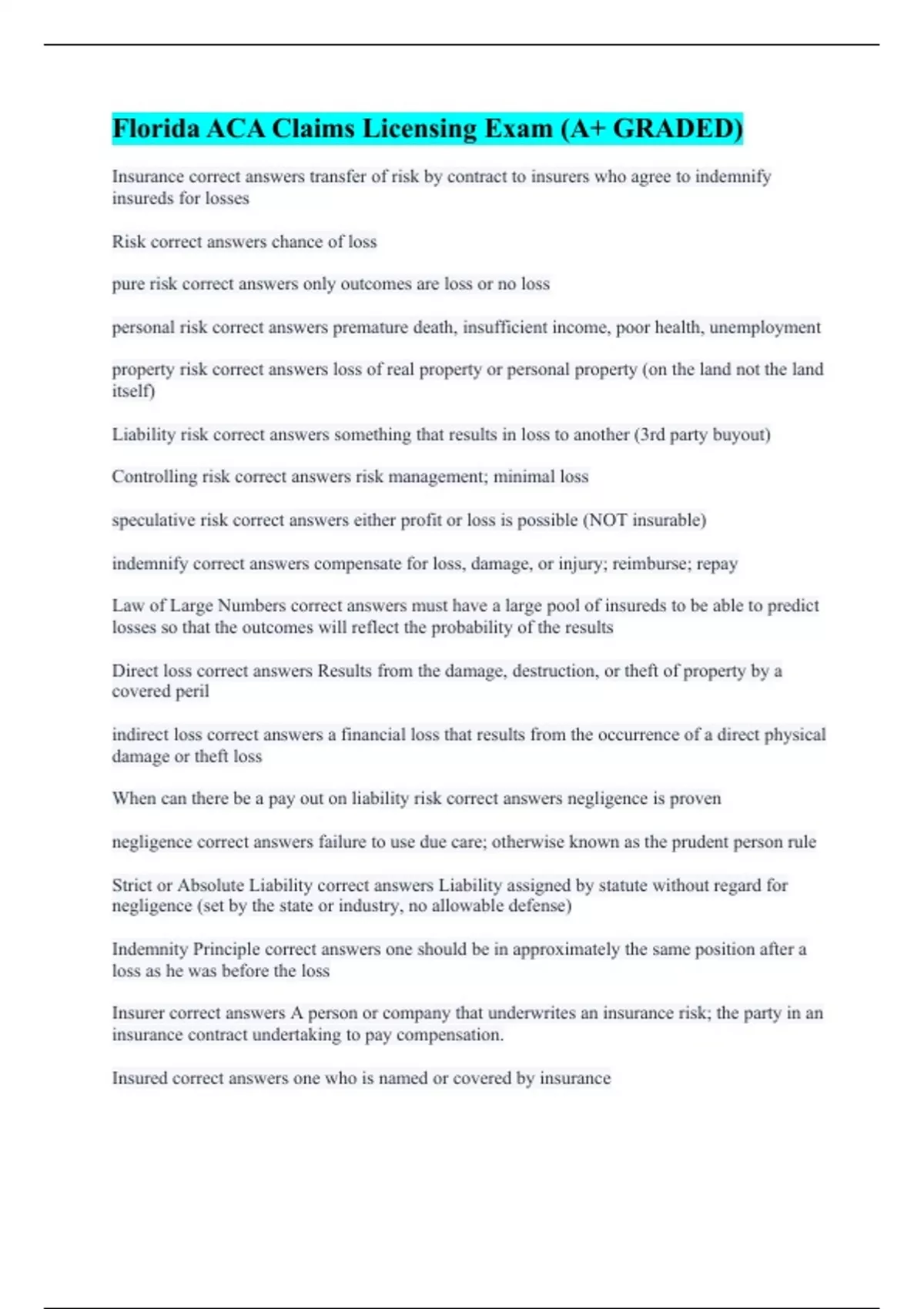 Florida ACA Claims Licensing Exam (A+ GRADED)