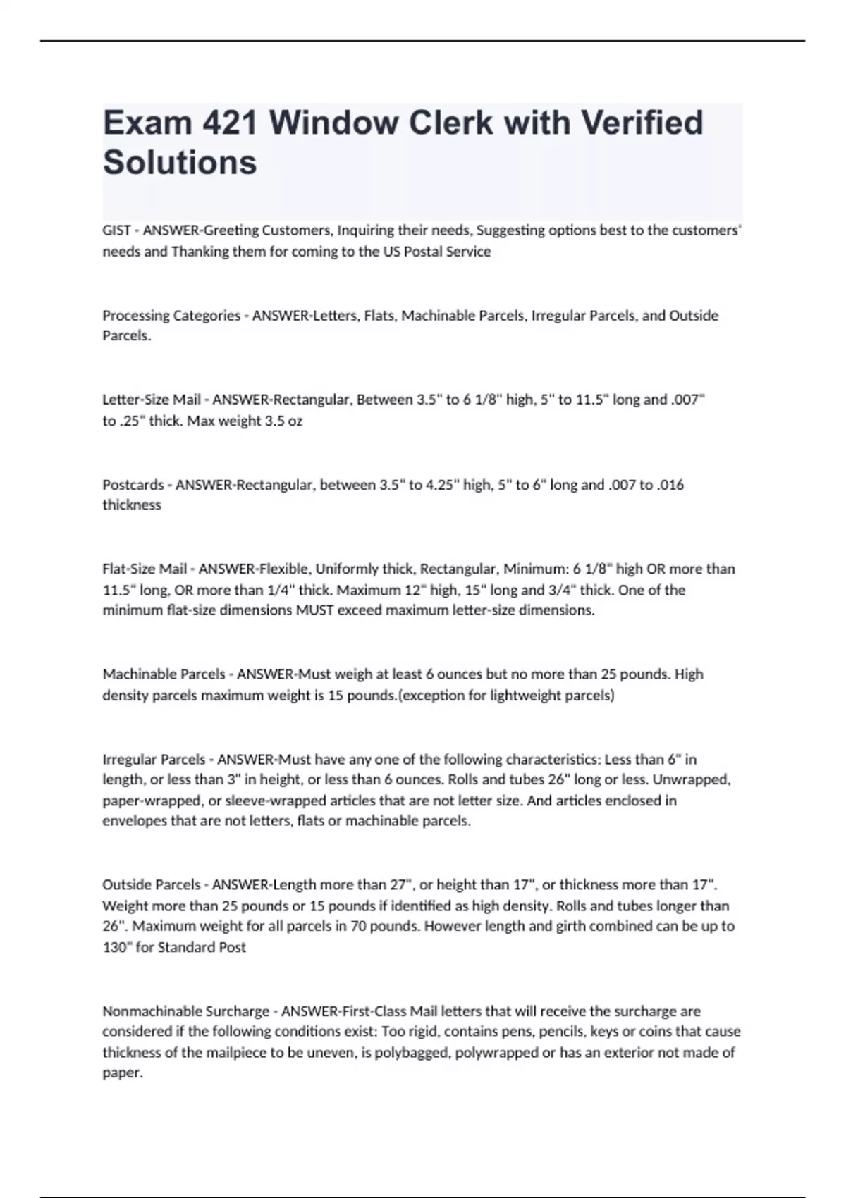 GIST - ANSWER-Greeting Customers, Inquiring their needs, Suggesting options best to the customers' needs and Thanking them for coming to the US Postal Service Processing Categories - ANSWER-Letters, Flats, Machinable Parcels, Irregular Parcels, and Outside Parcels. Letter-Size Mail - ANSWER-Rectangular, Between 3.5" to 6 1/8" high, 5" to 11.5" long and .007" to .25" thick. Max weight 3.5 oz Postcards - ANSWER-Rectangular, between 3.5" to 4.25" high, 5" to 6" long and .007 to .016 thickness Flat-Size Mail - ANSWER-Flexible, Uniformly thick, Rectangular, Minimum: 6 1/8" high OR more than 11.5" long, OR more than 1/4" thick. Maximum 12" high, 15" long and 3/4" thick. One of the minimum flat-size dimensions MUST exceed maximum letter-size dimensions. Machinable Parcels - ANSWER-Must weigh at least 6 ounces but no more than 25 pounds. High density parcels maximum weight is 15 pounds.(exception for lightweight parcels) Irregular Parcels - ANSWER-Must have any one of the following characteristics: Less than 6" in length, or less than 3" in height, or less than 6 ounces. Rolls and tubes 26" long or less. Unwrapped, paper-wrapped, or sleeve-wrapped articles that are not letter size. And articles enclosed in envelopes that are not letters, flats or machinable parcels. Outside Parcels - ANSWER-Length more than 27", or height than 17", or thickness more than 17". Weight more than 25 pounds or 15 pounds if identified as high density. Rolls and tubes longer than 26". Maximum weight for all parcels in 70 pounds. However length and girth combined can be up to 130" for Standard Post Nonmachinable Surcharge - ANSWER-First-Class Mail letters that will receive the surcharge are considered if the following conditions exist: Too rigid, contains pens, pencils, keys or coins that cause thickness of the mailpiece to be uneven, is polybagged, polywrapped or has an exterior not made of paper.
