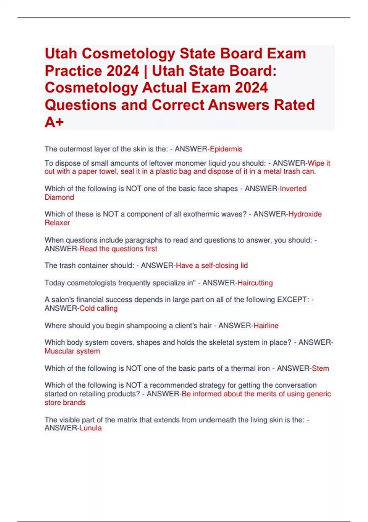 Utah Cosmetology State Board Exam Practice 2024 | Utah State Board: Cosmetology Actual Exam 2024 Questions and Correct Answers Rated A+