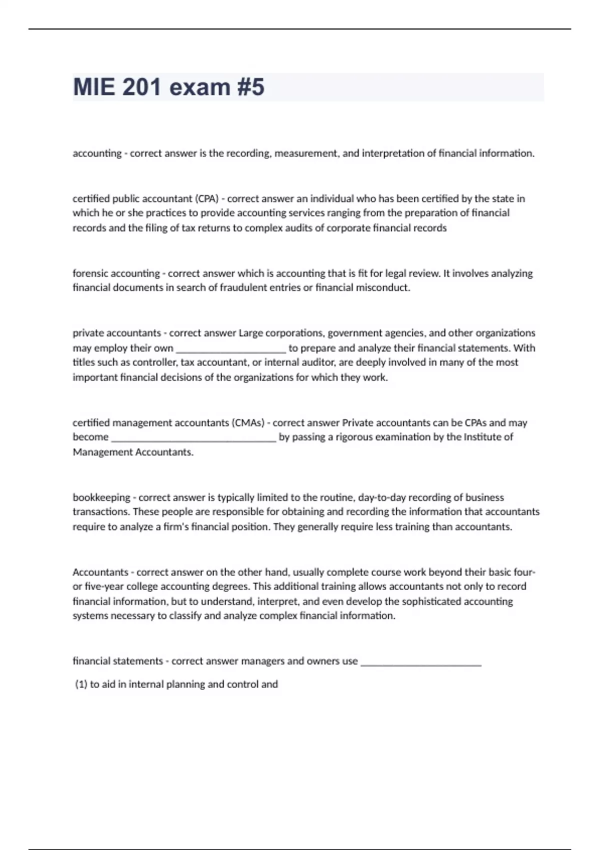 MIE 201 exam #5 accounting - correct answer is the recording, measurement, and interpretation of financial information. certified public accountant (CPA) - correct answer an individual who has been certified by the state in which he or she practices to provide accounting services ranging from the preparation of financial records and the filing of tax returns to complex audits of corporate financial records forensic accounting - correct answer which is accounting that is fit for legal review. It involves analyzing financial documents in search of fraudulent entries or financial misconduct. private accountants - correct answer Large corporations, government agencies, and other organizations may employ their own ____________________ to prepare and analyze their financial statements. With titles such as controller, tax accountant, or internal auditor, are deeply involved in many of the most important financial decisions of the organizations for which they work. certified management accountants (CMAs) - correct answer Private accountants can be CPAs and may become ______________________________ by passing a rigorous examination by the Institute of Management Accountants. bookkeeping - correct answer is typically limited to the routine, day-to-day recording of business transactions. These people are responsible for obtaining and recording the information that accountants require to analyze a firm's financial position. They generally require less training than accountants. Accountants - correct answer on the other hand, usually complete course work beyond their basic four- or five-year college accounting degrees. This additional training allows accountants not only to record financial information, but to understand, interpret, and even develop the sophisticated accounting systems necessary to classify and analyze complex financial information. financial statements - correct answer managers and owners use ______________________ (1) to aid in internal planning and control and