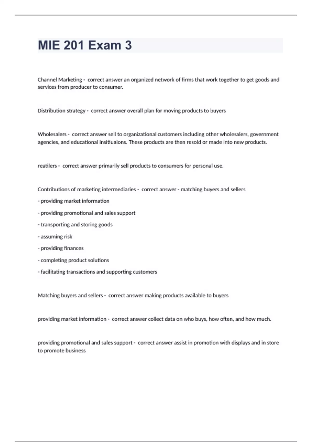 MIE 201 Exam 3 Channel Marketing - correct answer an organized network of firms that work together to get goods and services from producer to consumer. Distribution strategy - correct answer overall plan for moving products to buyers Wholesalers - correct answer sell to organizational customers including other wholesalers, government agencies, and educational insitiuaions. These products are then resold or made into new products. reatilers - correct answer primarily sell products to consumers for personal use. Contributions of marketing intermediaries - correct answer - matching buyers and sellers - providing market information - providing promotional and sales support - transporting and storing goods - assuming risk - providing finances - completing product solutions - facilitating transactions and supporting customers Matching buyers and sellers - correct answer making products available to buyers providing market information - correct answer collect data on who buys, how often, and how much. providing promotional and sales support - correct answer assist in promotion with displays and in store to promote business