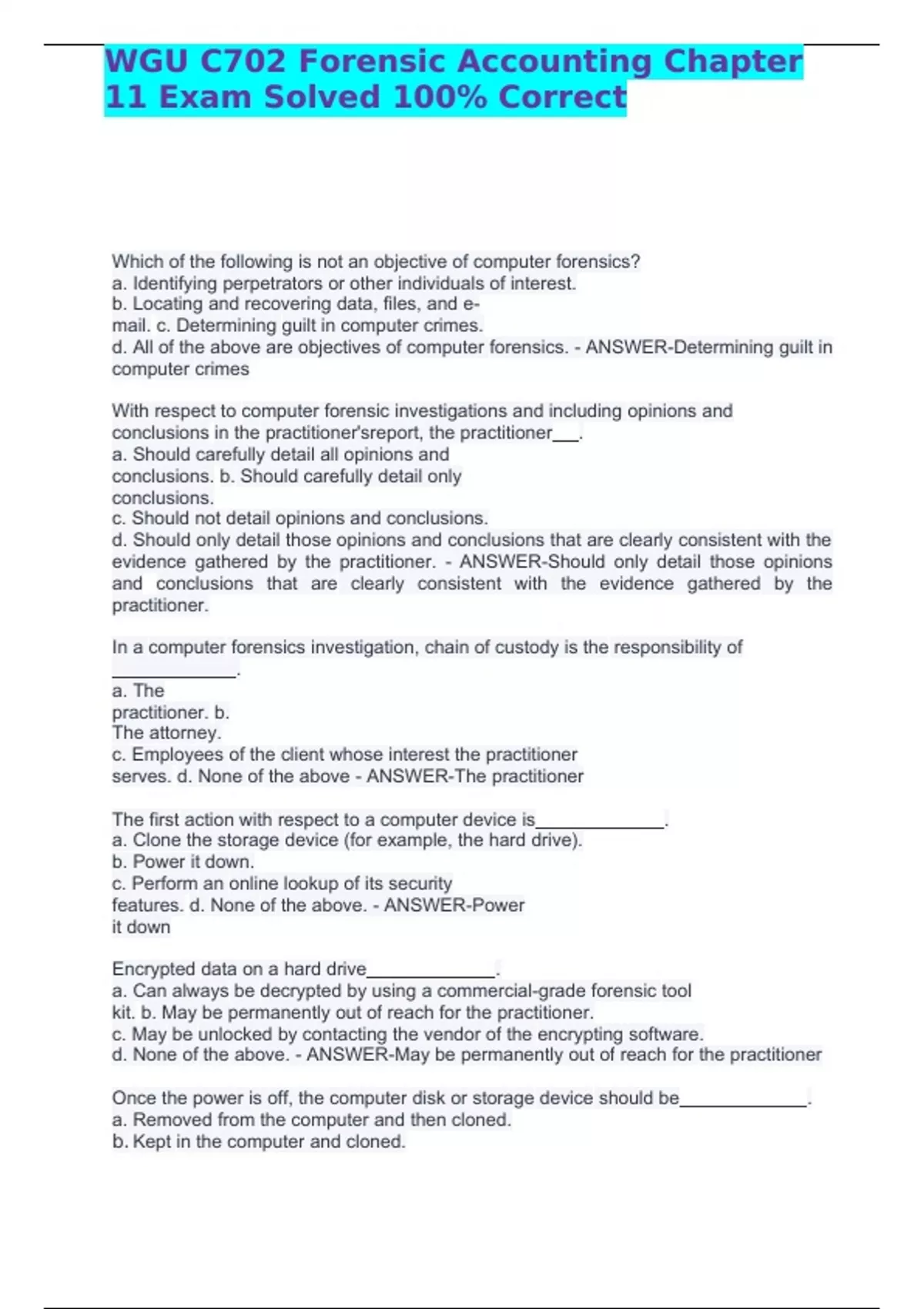 WGU C702 Forensic Accounting Chapter 11 Exam Solved 100% Correct Which of the following is not an objective of computer forensics? a. Identifying perpetrators or other individuals of interest. b. Locating and recovering data, files, and e-mail. c. Determining guilt in computer crimes. d. All of the above are objectives of computer forensics. - ANSWER-Determining guilt in computer crimes With respect to computer forensic investigations and including opinions and conclusions in the practitioner'sreport, the practitioner . a. Should carefully detail all opinions and conclusions. b. Should carefully detail only conclusions. c. Should not detail opinions and conclusions. d. Should only detail those opinions and conclusions that are clearly consistent with the evidence gathered by the practitioner. - ANSWER-Should only detail those opinions and conclusions that are clearly consistent with the evidence gathered by the practitioner.