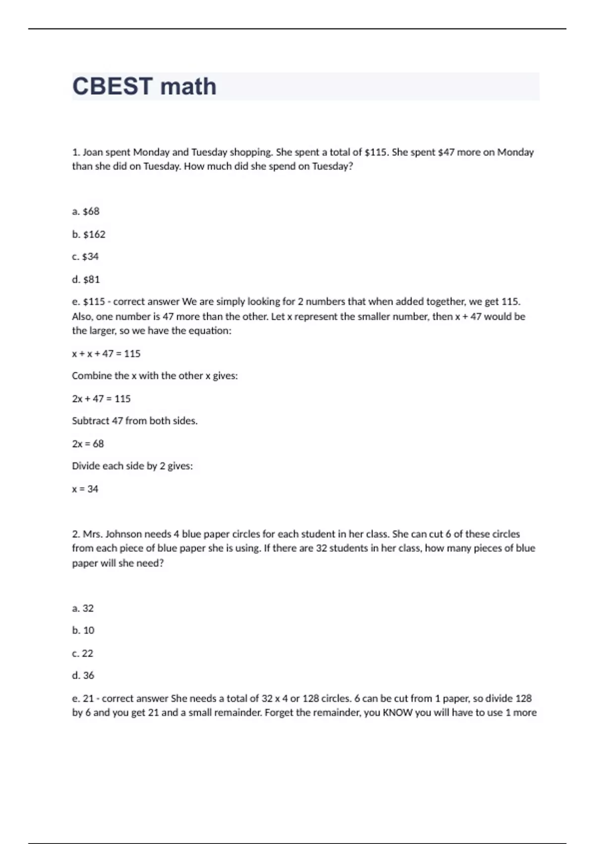 CBEST math1. Joan spent Monday and Tuesday shopping. She spent a total of $115. She spent $47 more on Monday than she did on Tuesday. How much did she spend on Tuesday? a. $68 b. $162 c. $34 d. $81 e. $115 - correct answer We are simply looking for 2 numbers that when added together, we get 115. Also, one number is 47 more than the other. Let x represent the smaller number, then x + 47 would be the larger, so we have the equation: x + x + 47 = 115 Combine the x with the other x gives: 2x + 47 = 115 Subtract 47 from both sides. 2x = 68 Divide each side by 2 gives: x = 34 2. Mrs. Johnson needs 4 blue paper circles for each student in her class. She can cut 6 of these circles from each piece of blue paper she is using. If there are 32 students in her class, how many pieces of blue paper will she need? a. 32 b. 10 c. 22 d. 36 e. 21 - correct answer She needs a total of 32 x 4 or 128 circles. 6 can be cut from 1 paper, so divide 128 by 6 and you get 21 and a small remainder. Forget the remainder, you KNOW you will have to use 1 more