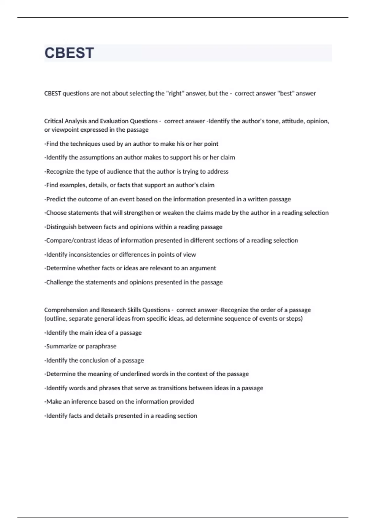 CBESTCBEST questions are not about selecting the "right" answer, but the - correct answer "best" answer Critical Analysis and Evaluation Questions - correct answer -Identify the author's tone, attitude, opinion, or viewpoint expressed in the passage -Find the techniques used by an author to make his or her point -Identify the assumptions an author makes to support his or her claim -Recognize the type of audience that the author is trying to address -Find examples, details, or facts that support an author's claim -Predict the outcome of an event based on the information presented in a written passage -Choose statements that will strengthen or weaken the claims made by the author in a reading selection -Distinguish between facts and opinions within a reading passage -Compare/contrast ideas of information presented in different sections of a reading selection -Identify inconsistencies or differences in points of view -Determine whether facts or ideas are relevant to an argument -Challenge the statements and opinions presented in the passage Comprehension and Research Skills Questions - correct answer -Recognize the order of a passage (outline, separate general ideas from specific ideas, ad determine sequence of events or steps) -Identify the main idea of a passage -Summarize or paraphrase -Identify the conclusion of a passage -Determine the meaning of underlined words in the context of the passage -Identify words and phrases that serve as transitions between ideas in a passage -Make an inference based on the information provided -Identify facts and details presented in a reading section