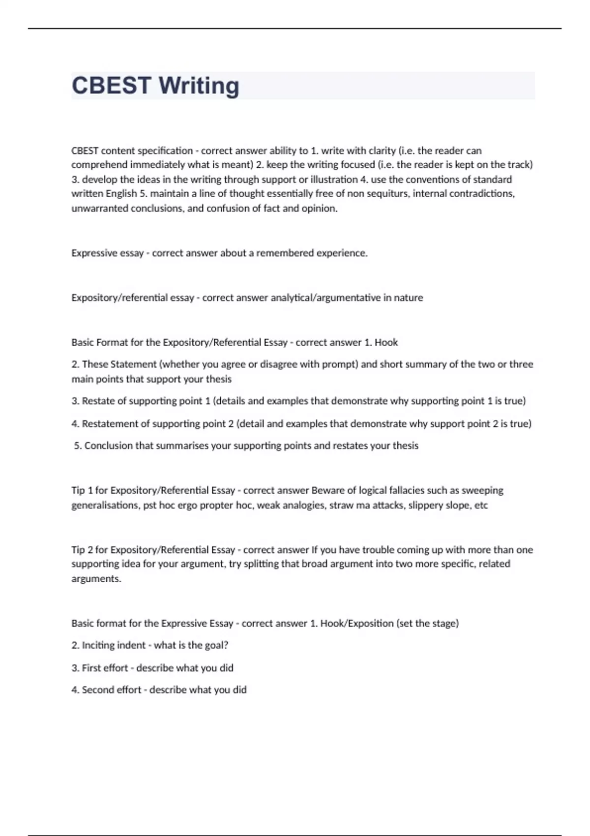 CBEST WritingCBEST content specification - correct answer ability to 1. write with clarity (i.e. the reader can comprehend immediately what is meant) 2. keep the writing focused (i.e. the reader is kept on the track) 3. develop the ideas in the writing through support or illustration 4. use the conventions of standard written English 5. maintain a line of thought essentially free of non sequiturs, internal contradictions, unwarranted conclusions, and confusion of fact and opinion. Expressive essay - correct answer about a remembered experience. Expository/referential essay - correct answer analytical/argumentative in nature Basic Format for the Expository/Referential Essay - correct answer 1. Hook 2. These Statement (whether you agree or disagree with prompt) and short summary of the two or three main points that support your thesis 3. Restate of supporting point 1 (details and examples that demonstrate why supporting point 1 is true) 4. Restatement of supporting point 2 (detail and examples that demonstrate why support point 2 is true) 5. Conclusion that summarises your supporting points and restates your thesis Tip 1 for Expository/Referential Essay - correct answer Beware of logical fallacies such as sweeping generalisations, pst hoc ergo propter hoc, weak analogies, straw ma attacks, slippery slope, etc Tip 2 for Expository/Referential Essay - correct answer If you have trouble coming up with more than one supporting idea for your argument, try splitting that broad argument into two more specific, related arguments. Basic format for the Expressive Essay - correct answer 1. Hook/Exposition (set the stage) 2. Inciting indent - what is the goal? 3. First effort - describe what you did 4. Second effort - describe what you did