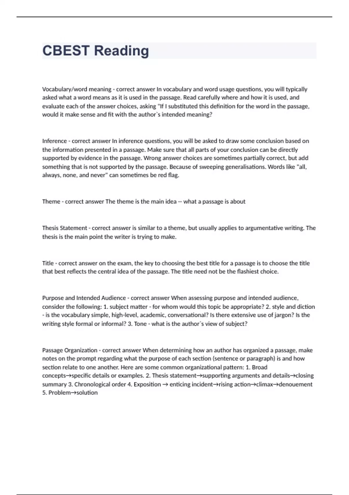 CBEST ReadingVocabulary/word meaning - correct answer In vocabulary and word usage questions, you will typically asked what a word means as it is used in the passage. Read carefully where and how it is used, and evaluate each of the answer choices, asking "If I substituted this definition for the word in the passage, would it make sense and fit with the author`s intended meaning? Inference - correct answer In inference questions, you will be asked to draw some conclusion based on the information presented in a passage. Make sure that all parts of your conclusion can be directly supported by evidence in the passage. Wrong answer choices are sometimes partially correct, but add something that is not supported by the passage. Because of sweeping generalisations. Words like "all, always, none, and never" can sometimes be red flag. Theme - correct answer The theme is the main idea -- what a passage is about Thesis Statement - correct answer is similar to a theme, but usually applies to argumentative writing. The thesis is the main point the writer is trying to make. Title - correct answer on the exam, the key to choosing the best title for a passage is to choose the title that best reflects the central idea of the passage. The title need not be the flashiest choice. Purpose and Intended Audience - correct answer When assessing purpose and intended audience, consider the following: 1. subject matter - for whom would this topic be appropriate? 2. style and diction - is the vocabulary simple, high-level, academic, conversational? Is there extensive use of jargon? Is the writing style formal or informal? 3. Tone - what is the author`s view of subject? Passage Organization - correct answer When determining how an author has organized a passage, make notes on the prompt regarding what the purpose of each section (sentence or paragraph) is and how section relate to one another. Here are some common organizational pattern: 1. Broad concepts→specific details or examples. 2. Thesis statement→supporting arguments and details→closing summary 3. Chronological order 4. Exposition → enticing incident→rising action→climax→denouement 5. Problem→solution