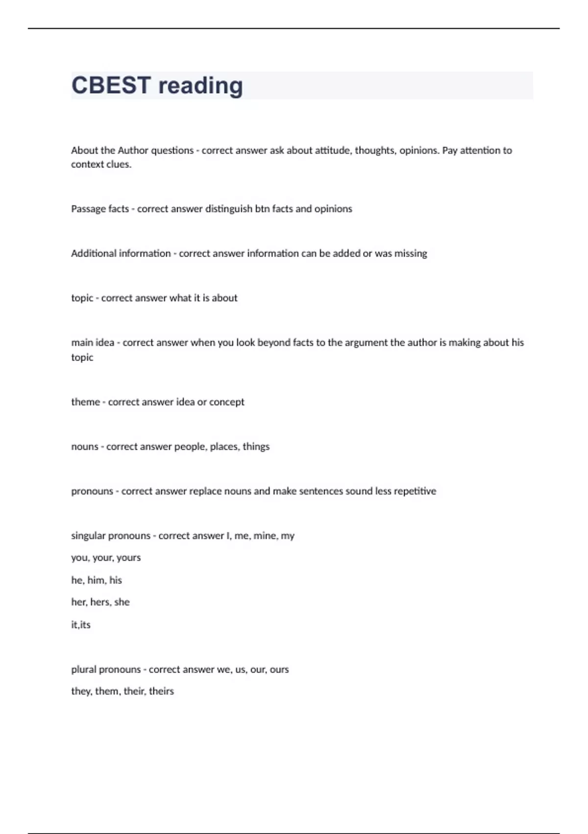 CBEST reading About the Author questions - correct answer ask about attitude, thoughts, opinions. Pay attention to context clues. Passage facts - correct answer distinguish btn facts and opinions Additional information - correct answer information can be added or was missing topic - correct answer what it is about main idea - correct answer when you look beyond facts to the argument the author is making about his topic theme - correct answer idea or concept nouns - correct answer people, places, things pronouns - correct answer replace nouns and make sentences sound less repetitive singular pronouns - correct answer I, me, mine, my you, your, yours he, him, his her, hers, she it,its plural pronouns - correct answer we, us, our, ours they, them, their, theirs