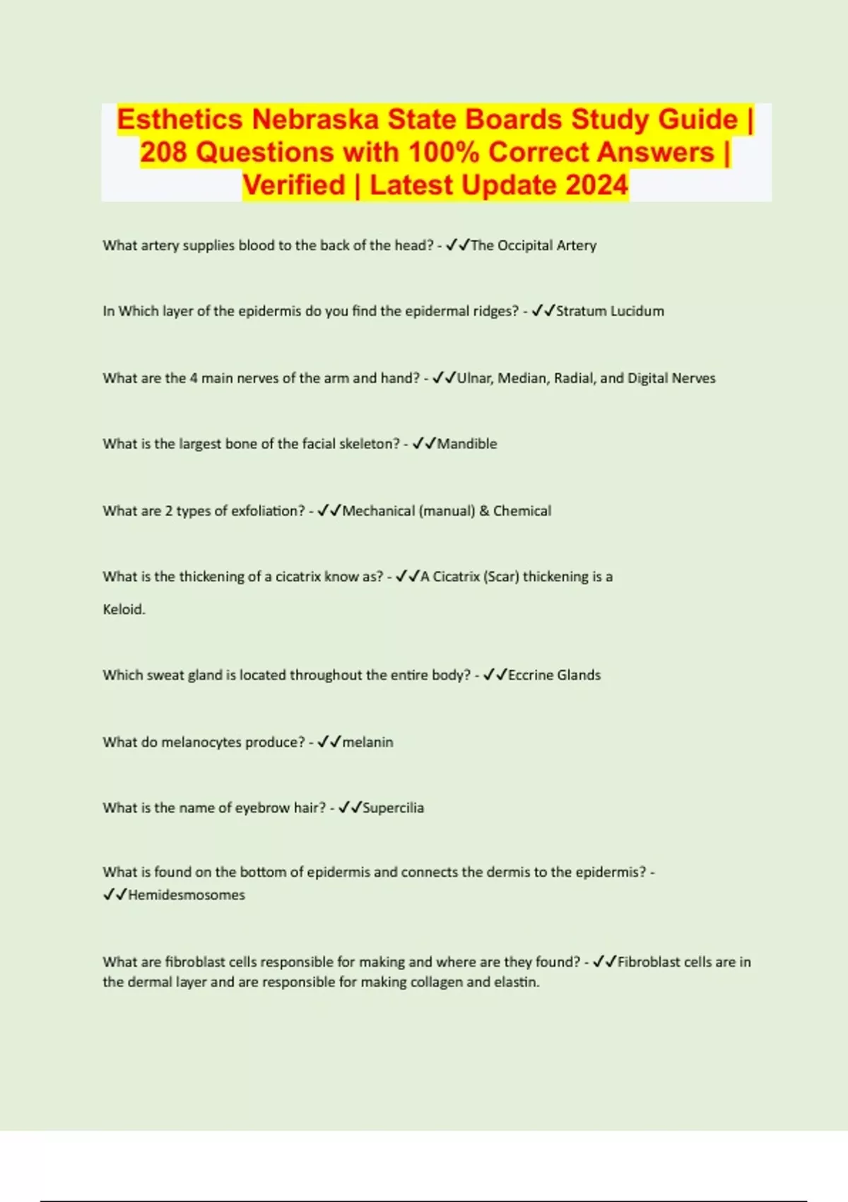 Esthetics Nebraska State Boards Study Guide | 208 Questions with 100% Correct Answers | Verified | Latest Update 2024