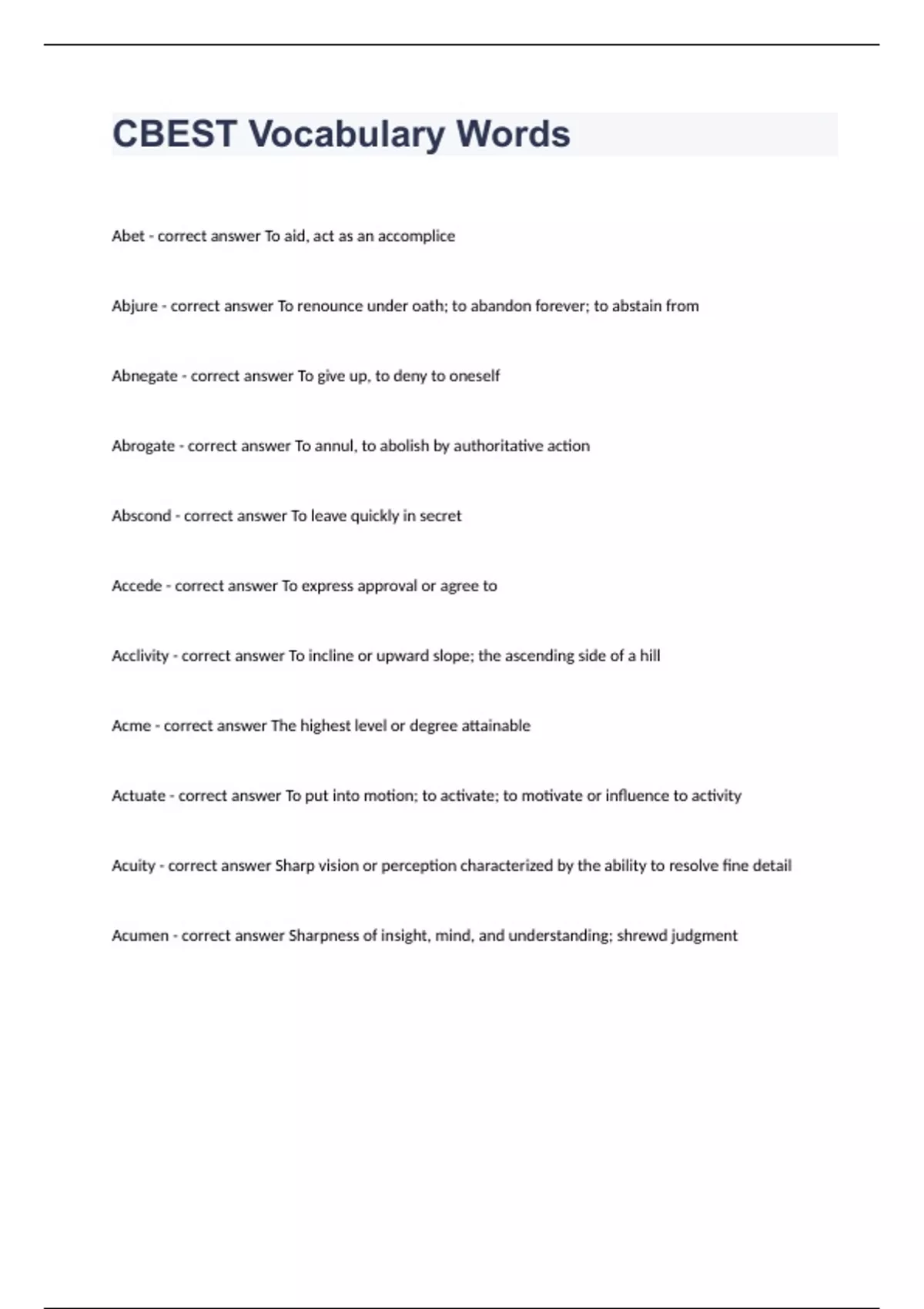CBEST Vocabulary WordsAbet - correct answer To aid, act as an accomplice Abjure - correct answer To renounce under oath; to abandon forever; to abstain from Abnegate - correct answer To give up, to deny to oneself Abrogate - correct answer To annul, to abolish by authoritative action Abscond - correct answer To leave quickly in secret Accede - correct answer To express approval or agree to Acclivity - correct answer To incline or upward slope; the ascending side of a hill Acme - correct answer The highest level or degree attainable Actuate - correct answer To put into motion; to activate; to motivate or influence to activity Acuity - correct answer Sharp vision or perception characterized by the ability to resolve fine detail Acumen - correct answer Sharpness of insight, mind, and understanding; shrewd judgment