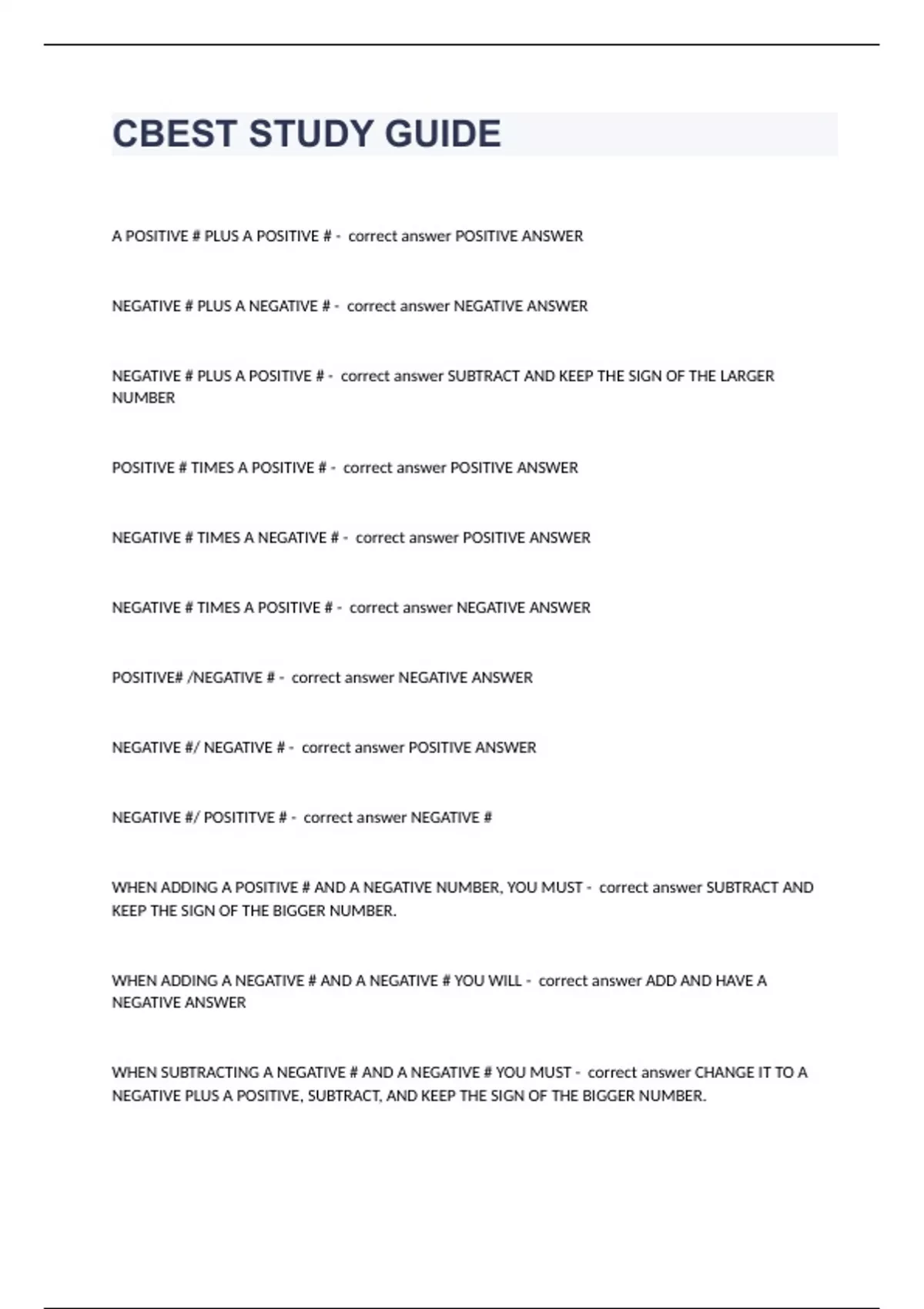 CBEST STUDY GUIDEA POSITIVE # PLUS A POSITIVE # - correct answer POSITIVE ANSWER NEGATIVE # PLUS A NEGATIVE # - correct answer NEGATIVE ANSWER NEGATIVE # PLUS A POSITIVE # - correct answer SUBTRACT AND KEEP THE SIGN OF THE LARGER NUMBER POSITIVE # TIMES A POSITIVE # - correct answer POSITIVE ANSWER NEGATIVE # TIMES A NEGATIVE # - correct answer POSITIVE ANSWER NEGATIVE # TIMES A POSITIVE # - correct answer NEGATIVE ANSWER POSITIVE# /NEGATIVE # - correct answer NEGATIVE ANSWER NEGATIVE #/ NEGATIVE # - correct answer POSITIVE ANSWER NEGATIVE #/ POSITITVE # - correct answer NEGATIVE # WHEN ADDING A POSITIVE # AND A NEGATIVE NUMBER, YOU MUST - correct answer SUBTRACT AND KEEP THE SIGN OF THE BIGGER NUMBER. WHEN ADDING A NEGATIVE # AND A NEGATIVE # YOU WILL - correct answer ADD AND HAVE A NEGATIVE ANSWER