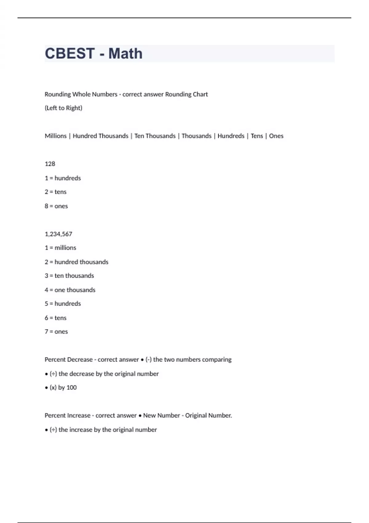 CBEST - M Rounding Whole Numbers - correct answer Rounding Chart (Left to Right) Millions | Hundred Thousands | Ten Thousands | Thousands | Hundreds | Tens | Ones 128 1 = hundreds 2 = tens 8 = ones 1,234,567 1 = millions 2 = hundred thousands 3 = ten thousands 4 = one thousands 5 = hundreds 6 = tens 7 = ones Percent Decrease - correct answer • (-) the two numbers comparing • (÷) the decrease by the original number • (x) by 100 Percent Increase - correct answer • New Number - Original Number. • (÷) the increase by the original number • (x) by 100 • Formula: % increase = Increase ÷ Original Number × 100. Estimate of a Quotient - correct answer • round divisor & dividend • (÷) • ≈ Rounding Decimals - correct answer Before Decimal (Left to Right) Thousands | Hundreds | Tens | Ones ___________________ After Decimal (Left to Right) Tenths Hundredths Thousandths 3,528.740 3 = thousandths 5 = hundreds