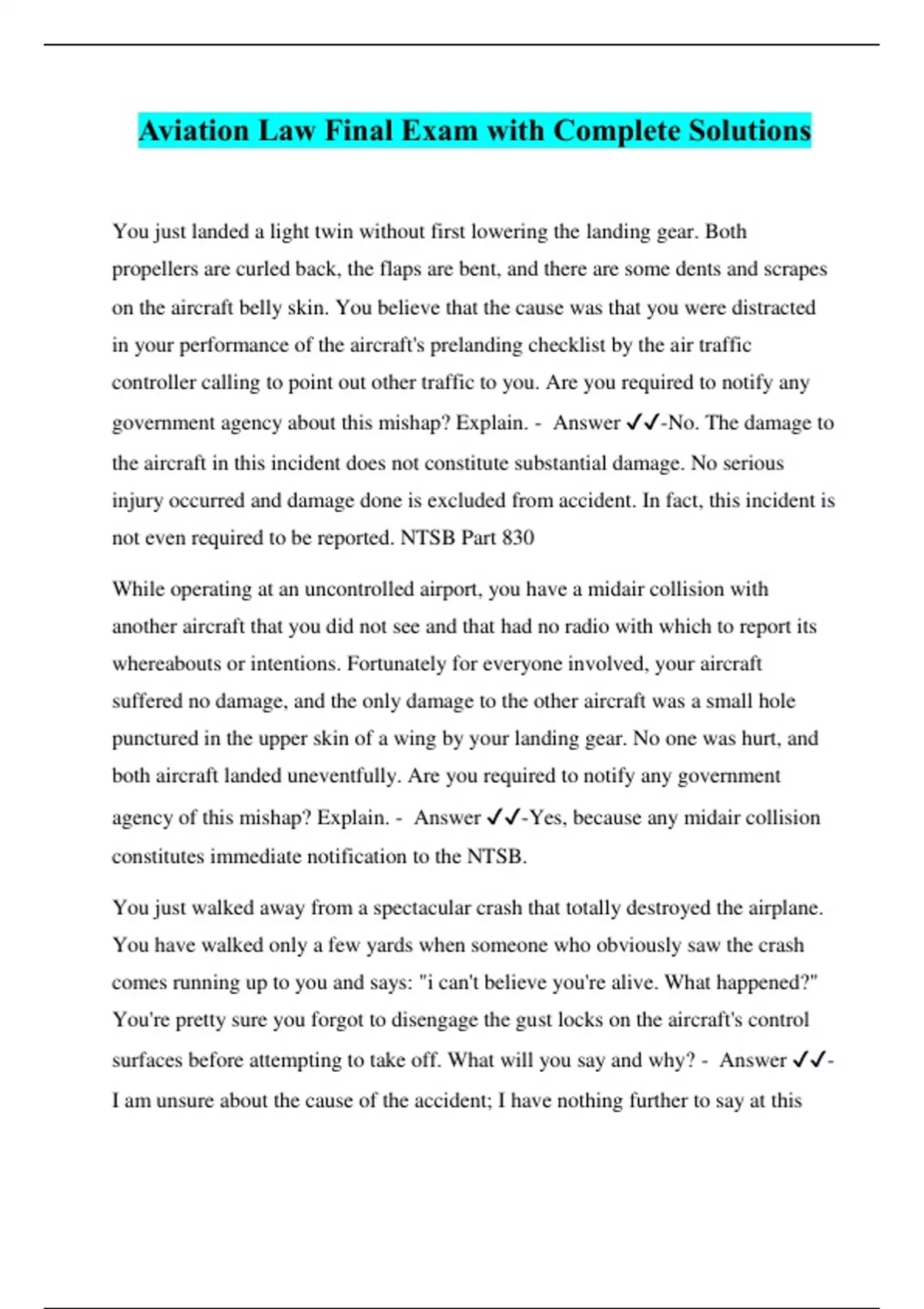 Aviation Law Final Exam with Complete Solutions