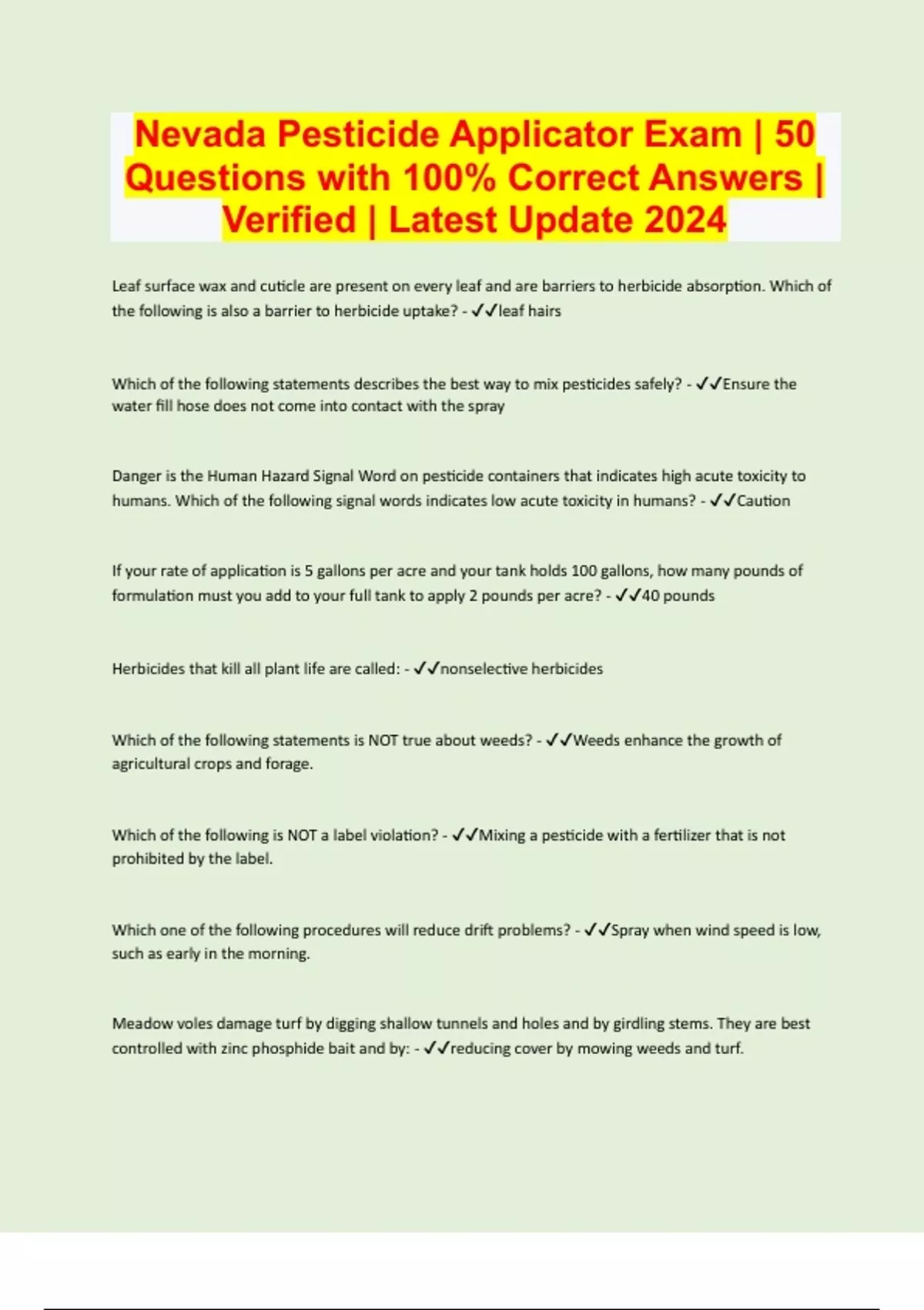 Nevada Pesticide Applicator Exam | 50 Questions with 100% Correct Answers | Verified | Latest Update 2024
