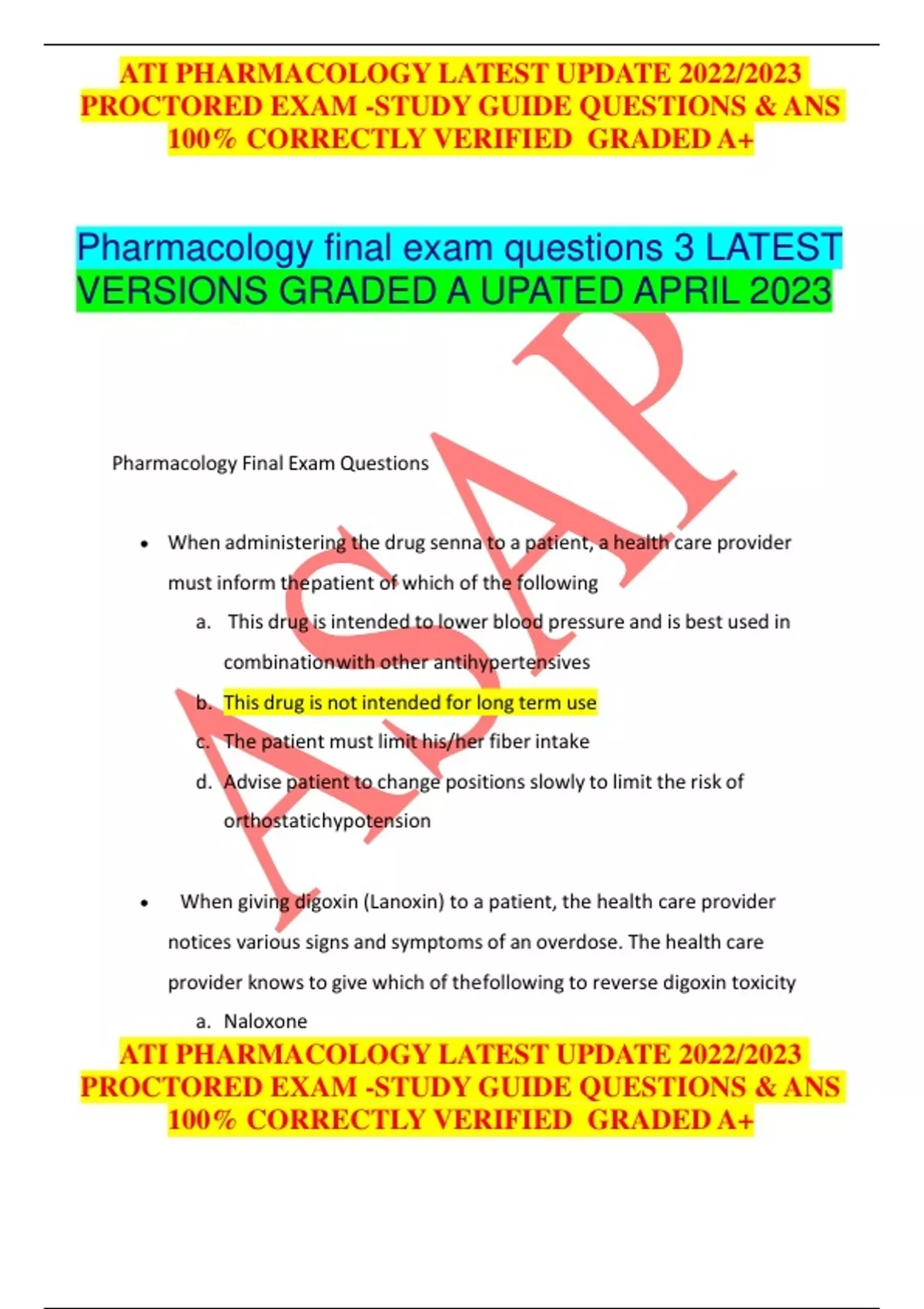 ATI PHARMACOLOGY LATEST UPDATE 2022/2023 PROCTORED EXAM -STUDY GUIDE QUESTIONS & ANS 100% CORRECTLY VERIFIED GRADED A+