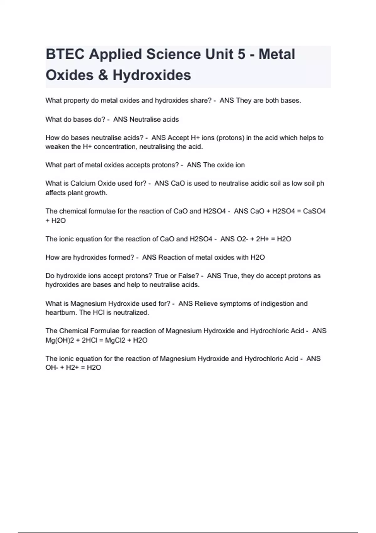 BTEC Applied Science Unit 5 - Metal Oxides & Hydroxides Questions with correct Answers A+GRADED & VERIFIED
